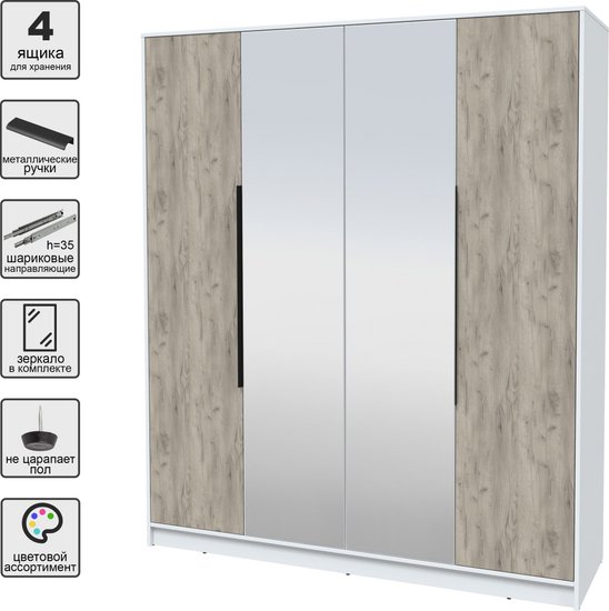 ✅ Шкаф Интерлиния Концепт КТ-Ш4з — это идеальное решение для хранения одежды и других вещей в вашем доме. Его стильный и современный дизайн прекрасно впишется в любую жилую комнату, спальню или прихожую, добавляя нотку элегантности и функциональности.✅ Изготовленный из качественного ЛДСП, этот платяной шкаф отличается прочностью и долговечностью. Зеркальные фасады не только визуально увеличивают пространство, но и придают интерьеру особый шарм. Четыре двери обеспечивают легкий доступ к содержимому, а продуманное наполнение с полками, штангой и ящиками позволяет удобно организовать хранение.✅ Удобная напольная установка шкафа делает его идеальным выбором для любого помещения. Шариковые направляющие обеспечивают плавное открытие и закрытие дверей, что добавляет комфорта в повседневное использование. ⚠️ Обратите внимание, что шкаф поставляется в разобранном виде, что позволяет легко транспортировать его и устанавливать в нужном месте. ✅ Шкаф Интерлиния Концепт КТ-Ш4з — это не просто мебель, а стильный элемент вашего интерьера, который поможет поддерживать порядок и организованность в вашем доме.✅ Шкаф Интерлиния Концепт КТ-Ш4з — это идеальное решение для хранения одежды и других вещей в вашем доме. Его стильный и современный дизайн прекрасно впишется в любую жилую комнату, спальню или прихожую, добавляя нотку элегантности и функциональности.✅ Изготовленный из качественного ЛДСП, этот платяной шкаф отличается прочностью и долговечностью. Зеркальные фасады не только визуально увеличивают пространство, но и придают интерьеру особый шарм. Четыре двери обеспечивают легкий доступ к содержимому, а продуманное наполнение с полками, штангой и ящиками позволяет удобно организовать хранение.✅ Удобная напольная установка шкафа делает его идеальным выбором для любого помещения. Шариковые направляющие обеспечивают плавное открытие и закрытие дверей, что добавляет комфорта в повседневное использование. ⚠️ Обратите внимание, что шкаф поставляется в разобранном виде, что позволяет легко транспортировать его и устанавливать в нужном месте. ✅ Шкаф Интерлиния Концепт КТ-Ш4з — это не просто мебель, а стильный элемент вашего интерьера, который поможет поддерживать порядок и организованность в вашем доме.