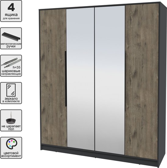 ✅ Шкаф Интерлиния Концепт КТ-Ш4з — это идеальное решение для вашего интерьера, которое сочетает в себе стиль и функциональность. Он прекрасно впишется в любую жилую комнату, спальню или прихожую, обеспечивая удобное хранение одежды и других вещей.✅ Этот платяной шкаф с четырьмя дверями предлагает достаточно пространства для хранения, благодаря продуманному наполнению, включающему полки, штангу для вешалок и ящики. Вы сможете легко организовать свои вещи и поддерживать порядок в доме.✅ Изготовленный из качественного ЛДСП, шкаф отличается прочностью и долговечностью. Зеркальные фасады добавляют визуального объема и света в помещение, а черный каркас придает современный и стильный вид.✅ Удобная напольная установка и шариковые направляющие обеспечивают легкость в использовании и долговечность. Шкаф поставляется в разобранном виде, что упрощает транспортировку и сборку.⚠️ Не упустите возможность обновить свой интерьер с помощью шкафа Интерлиния Концепт КТ-Ш4з, который станет не только функциональным элементом, но и стильным акцентом в вашем доме.✅ Шкаф Интерлиния Концепт КТ-Ш4з — это идеальное решение для вашего интерьера, которое сочетает в себе стиль и функциональность. Он прекрасно впишется в любую жилую комнату, спальню или прихожую, обеспечивая удобное хранение одежды и других вещей.✅ Этот платяной шкаф с четырьмя дверями предлагает достаточно пространства для хранения, благодаря продуманному наполнению, включающему полки, штангу для вешалок и ящики. Вы сможете легко организовать свои вещи и поддерживать порядок в доме.✅ Изготовленный из качественного ЛДСП, шкаф отличается прочностью и долговечностью. Зеркальные фасады добавляют визуального объема и света в помещение, а черный каркас придает современный и стильный вид.✅ Удобная напольная установка и шариковые направляющие обеспечивают легкость в использовании и долговечность. Шкаф поставляется в разобранном виде, что упрощает транспортировку и сборку.⚠️ Не упустите возможность обновить свой интерьер с помощью шкафа Интерлиния Концепт КТ-Ш4з, который станет не только функциональным элементом, но и стильным акцентом в вашем доме.