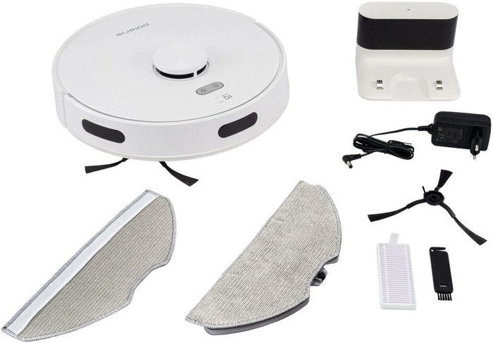 Комплектациябаза для зарядки, боковая щётка, электрощётка, НЕРА-фильтр, контейнер для пыли, контейнер для воды, инструкция