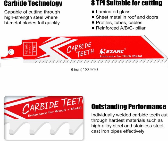 • ✅Твердосплавное пильное полотно длиной 6 дюймов предназначено для эффективной резки толстого металла и чугуна. Оно обладает высокой прочностью и долговечностью; что позволяет использовать одно полотно для множества проектов без необходимости частой замены.✅Полотно оснащено 8 зубьями на дюйм; что обеспечивает плавный и точный рез твердых металлов; включая нержавеющую сталь; арматуру и закаленную сталь. Это делает его идеальным инструментом для сложных металлических работ.✅Каждый зуб выполнен из твердосплавного материала и прецизионно шлифован; что гарантирует высокую ударопрочность и гибкость при работе. Полотно выдерживает нагрузки при сносе зданий и других тяжелых условиях эксплуатации.✅Универсальный хвостовик 1/2 дюйма совместим с большинством популярных брендов; таких как Milwaukee; Bosch и DeWalt. В комплекте поставляется 3 полотна; подходящих для резки металла толщиной от 3/16 до 1/2 дюйма. ✅Твердосплавное пильное полотно длиной 6 дюймов предназначено для эффективной резки толстого металла и чугуна. Оно обладает высокой прочностью и долговечностью; что позволяет использовать одно полотно для множества проектов без необходимости частой замены.✅Полотно оснащено 8 зубьями на дюйм; что обеспечивает плавный и точный рез твердых металлов; включая нержавеющую сталь; арматуру и закаленную сталь. Это делает его идеальным инструментом для сложных металлических работ.✅Каждый зуб выполнен из твердосплавного материала и прецизионно шлифован; что гарантирует высокую ударопрочность и гибкость при работе. Полотно выдерживает нагрузки при сносе зданий и других тяжелых условиях эксплуатации.✅Универсальный хвостовик 1/2 дюйма совместим с большинством популярных брендов; таких как Milwaukee; Bosch и DeWalt. В комплекте поставляется 3 полотна; подходящих для резки металла толщиной от 3/16 до 1/2 дюйма.