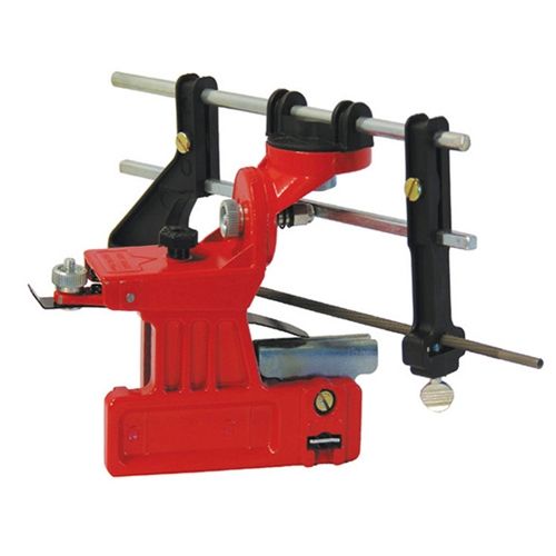 Станок выполняет обработку пильных цепей прямо на направляющей шине инструмента. Он закрепляется с обеих сторон при помощи надежных винтов. При необходимости угол заточки можно изменить. Для этого на корпусе инструмента есть градусная разметка углов. Пильный элемент удобно фиксировать в нужном положении. Этому способствует специальная измерительная ручка.