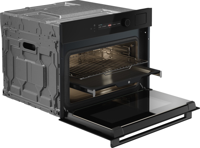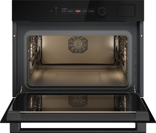 Особенности дизайна и внешней панели управления — также важный пункт при выборе духовки на кухню. В данной модели нужно обратить внимание на цвет — черное стекло, охлаждение двери, чтобы поверхность и мебель вокруг не нагревались.
