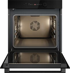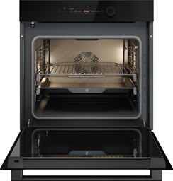 Особенности дизайна и внешней панели управления — также важный пункт при выборе духовки на кухню. В данной модели нужно обратить внимание на цвет — черное стекло, охлаждение двери, чтобы поверхность и мебель вокруг не нагревались.