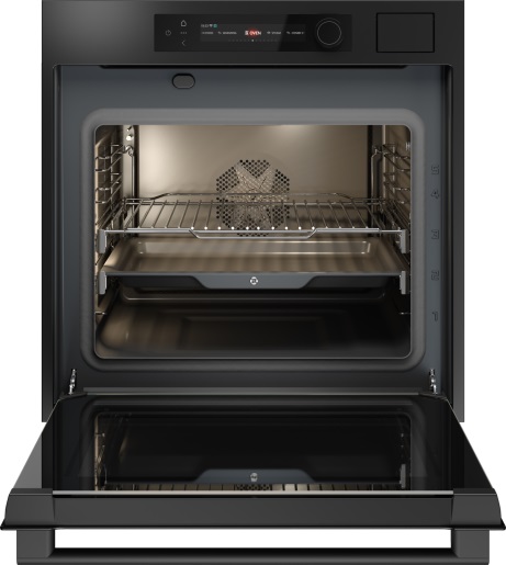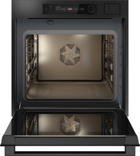 Особенности дизайна и внешней панели управления — также важный пункт при выборе духовки на кухню. В данной модели нужно обратить внимание на цвет — черный графит, охлаждение двери, чтобы поверхность и мебель вокруг не нагревались.