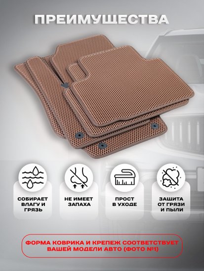 Автоковрики Mercedes-Benz - это современное решение для защиты салона автомобиля от грязи, влаги и пыли. Изготавливаются из инновационного полимерного материала EVA (этиленвинилацетат), который отличается легкостью, прочностью и долговечностью. Благодаря ячеистой структуре коврики надежно удерживают воду, песок, снег и мусор, предотвращая их распространение по салону.Такие коврики идеально повторяют форму пола автомобиля, не скользят и фиксируются в салоне с помощью специальных креплений. ЭВА-коврики легко моются водой, быстро сохнут и не впитывают запахи. Они не дубеют на морозе и не теряют эластичность при высоких температурах.Эти аксессуары подойдут для круглогодичного использования – летом защитят салон от пыли и песка, а зимой от снега и реагентов. Широкая цветовая гамма и возможность выбора окантовки позволяют подобрать автоковрики под стиль салона и сделать интерьер автомобиля более индивидуальным.Автоковрики Mercedes-Benz - это современное решение для защиты салона автомобиля от грязи, влаги и пыли. Изготавливаются из инновационного полимерного материала EVA (этиленвинилацетат), который отличается легкостью, прочностью и долговечностью. Благодаря ячеистой структуре коврики надежно удерживают воду, песок, снег и мусор, предотвращая их распространение по салону.Такие коврики идеально повторяют форму пола автомобиля, не скользят и фиксируются в салоне с помощью специальных креплений. ЭВА-коврики легко моются водой, быстро сохнут и не впитывают запахи. Они не дубеют на морозе и не теряют эластичность при высоких температурах.Эти аксессуары подойдут для круглогодичного использования – летом защитят салон от пыли и песка, а зимой от снега и реагентов. Широкая цветовая гамма и возможность выбора окантовки позволяют подобрать автоковрики под стиль салона и сделать интерьер автомобиля более индивидуальным.