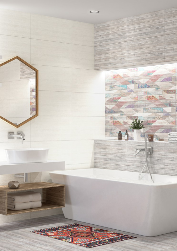 Эта коллекция воплощает в себе стиль шебби-шик, также известный как "потёртый блеск". Настенная плитка Shabby от Azori отличается сложной текстурой. Она создана в виде деревянной доски с покраской в оттенок слоновой кости. Для усиления эффекта дизайнеры добавили отпечаток льняной ткани поверх этих текстур, благодаря чему каждая дощечка кажется произведением индивидуального творчества мастера. Сопровождают ее бежевые и серые текстурированные модули, напоминающие вагонку. Для украшения была разработана многоцветная вставка Inti, представляющая собой наборной модуль из реек разных форматов, украшенных аутентичными орнаментами.