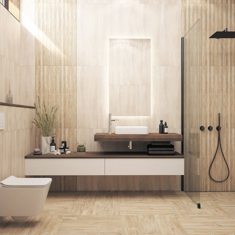 Фактура плитки коллекции Бунгало с деревянным дизайном воспевает природные и экологичные материалы. Создайте атмосферу, которая окунает вас в мир отдаленных островов и дарит ощущение спокойствия. Декоративная плитка Бунгало — это комбинация деревянных планок разных уровней, что создает естественный объем в интерьере. Любой из представленных цветовых вариантов передает тепло древесины, гармонично дополняя интерьер спальни, ванной комнаты и гостиной.