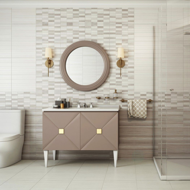 В коллекции НИДВУД имеется 4 оттенка основной плитки с древесной текстурой в форме узких планок: белый, серый, бежевый и темно-бежевый. Эту коллекцию дополняют два вида декоров, выполненные в мозаичном стиле, с теплой и холодной цветовой палитрой, представляющие собой «микс» мелких элементов древесной текстуры с вкраплениями орнамента.