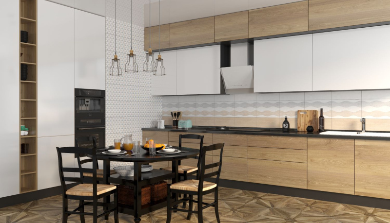 Коллекция КИОТО, выполненная на матовой глазури, сочетает текстуры серого и бежевого дерева со светло-каменной текстурой. В декоративных плитках коллекции доступны два варианта: двухцветный декор с волнистой структурой и мозаичный декор с треугольным узором.