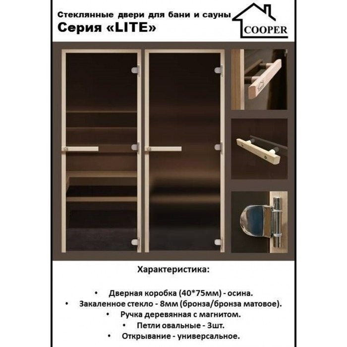 Дверь стеклянная для бани Cooper LITE 2000х800 Бронза матовая (коробка осина) с прямоугольной ручкой на магнитной защелке, крепится горизонтально. Дверь универсальная: может быть как правосторонней, так и левосторонней. Наличников в комплекте нет.