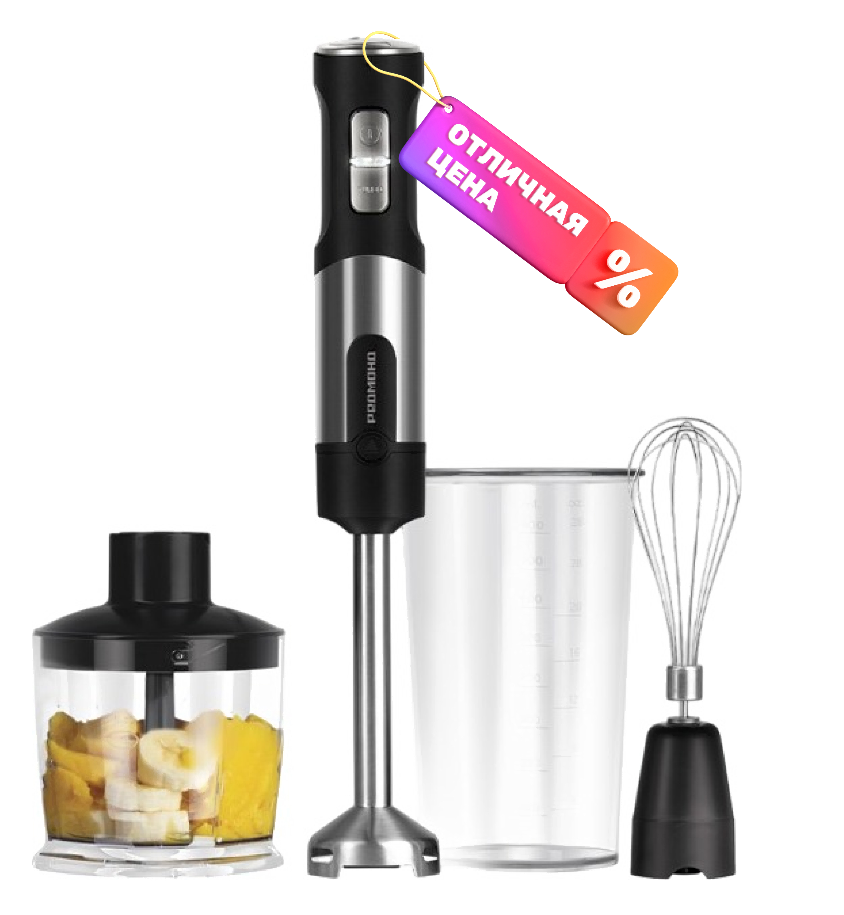 - В комплекте венчик (с переходником), измельчитель, мерный стакан (800 мл), чаша, насадка-блендер