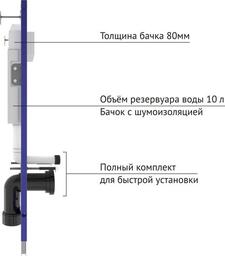✅Ключевые характеристикиИнсталляция предназначена для подвесного унитаза и оснащена механическим управлением с двухрежимным сливом объемом 3 и 6 литров. Максимальная нагрузка на конструкцию составляет 400 кг, что обеспечивает надежность и долговечность. Высота изделия регулируется в диапазоне от 115 до 139 см, ширина 52.5 см, глубина до 17.5 см.✅Преимущества и отличияМодель выполнена из металла с антикоррозийной эмалью и оцинкованной стали, что гарантирует устойчивость к коррозии и механическим повреждениям. В комплект входит шумоизоляция и кнопка смыва с покрытием soft-touch, обеспечивающая комфортное использование. Подвод воды осуществляется сверху, что упрощает монтаж и обслуживание.✅ПрактичностьИнсталляция оснащена регулируемой рамой по высоте, что позволяет адаптировать ее под различные условия установки. Кнопка смыва изготовлена из пластика ABS и имеет круглую форму, что удобно для эксплуатации. Комплект подходит для монтажа на капитальную стену и пол, обеспечивая универсальность применения.✅УникальностьДанная модель выделяется сочетанием прочной металлической конструкции с современным дизайном кнопки смыва в черном soft-touch покрытии. Производитель предоставляет гарантию 2 года, а также комплектует изделие шумоизоляцией, что повышает комфорт использования и снижает уровень шума при сливе воды.✅Ключевые характеристикиИнсталляция предназначена для подвесного унитаза и оснащена механическим управлением с двухрежимным сливом объемом 3 и 6 литров. Максимальная нагрузка на конструкцию составляет 400 кг, что обеспечивает надежность и долговечность. Высота изделия регулируется в диапазоне от 115 до 139 см, ширина 52.5 см, глубина до 17.5 см.✅Преимущества и отличияМодель выполнена из металла с антикоррозийной эмалью и оцинкованной стали, что гарантирует устойчивость к коррозии и механическим повреждениям. В комплект входит шумоизоляция и кнопка смыва с покрытием soft-touch, обеспечивающая комфортное использование. Подвод воды осуществляется сверху, что упрощает монтаж и обслуживание.✅ПрактичностьИнсталляция оснащена регулируемой рамой по высоте, что позволяет адаптировать ее под различные условия установки. Кнопка смыва изготовлена из пластика ABS и имеет круглую форму, что удобно для эксплуатации. Комплект подходит для монтажа на капитальную стену и пол, обеспечивая универсальность применения.✅УникальностьДанная модель выделяется сочетанием прочной металлической конструкции с современным дизайном кнопки смыва в черном soft-touch покрытии. Производитель предоставляет гарантию 2 года, а также комплектует изделие шумоизоляцией, что повышает комфорт использования и снижает уровень шума при сливе воды.
