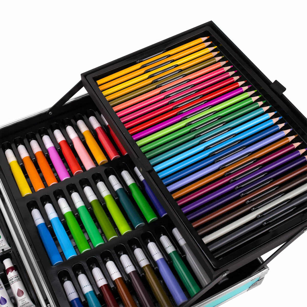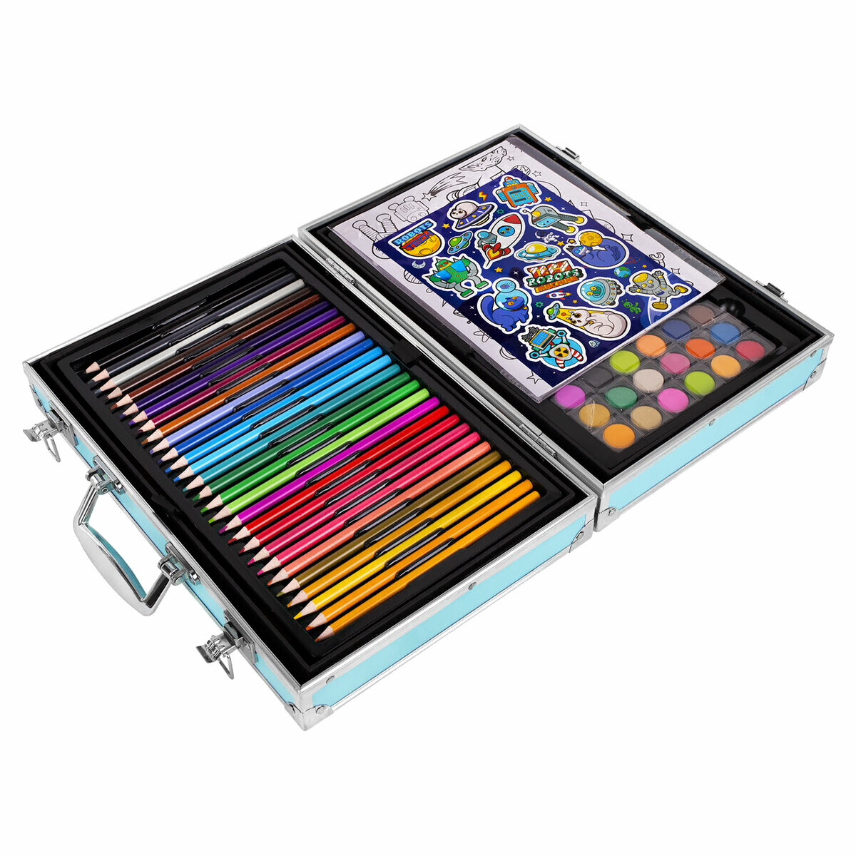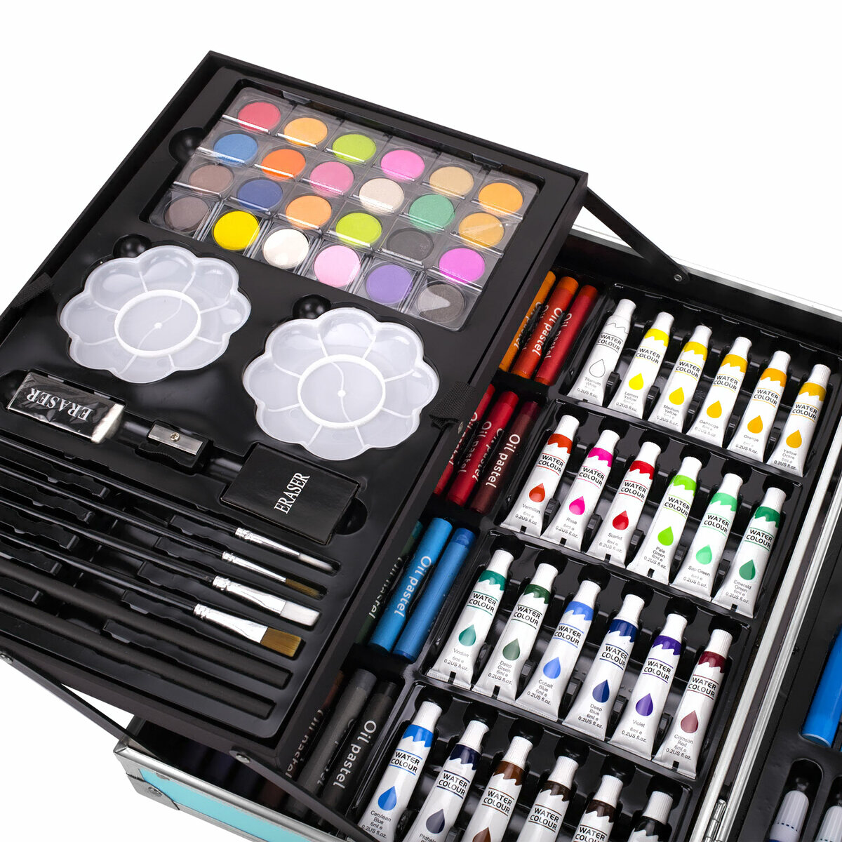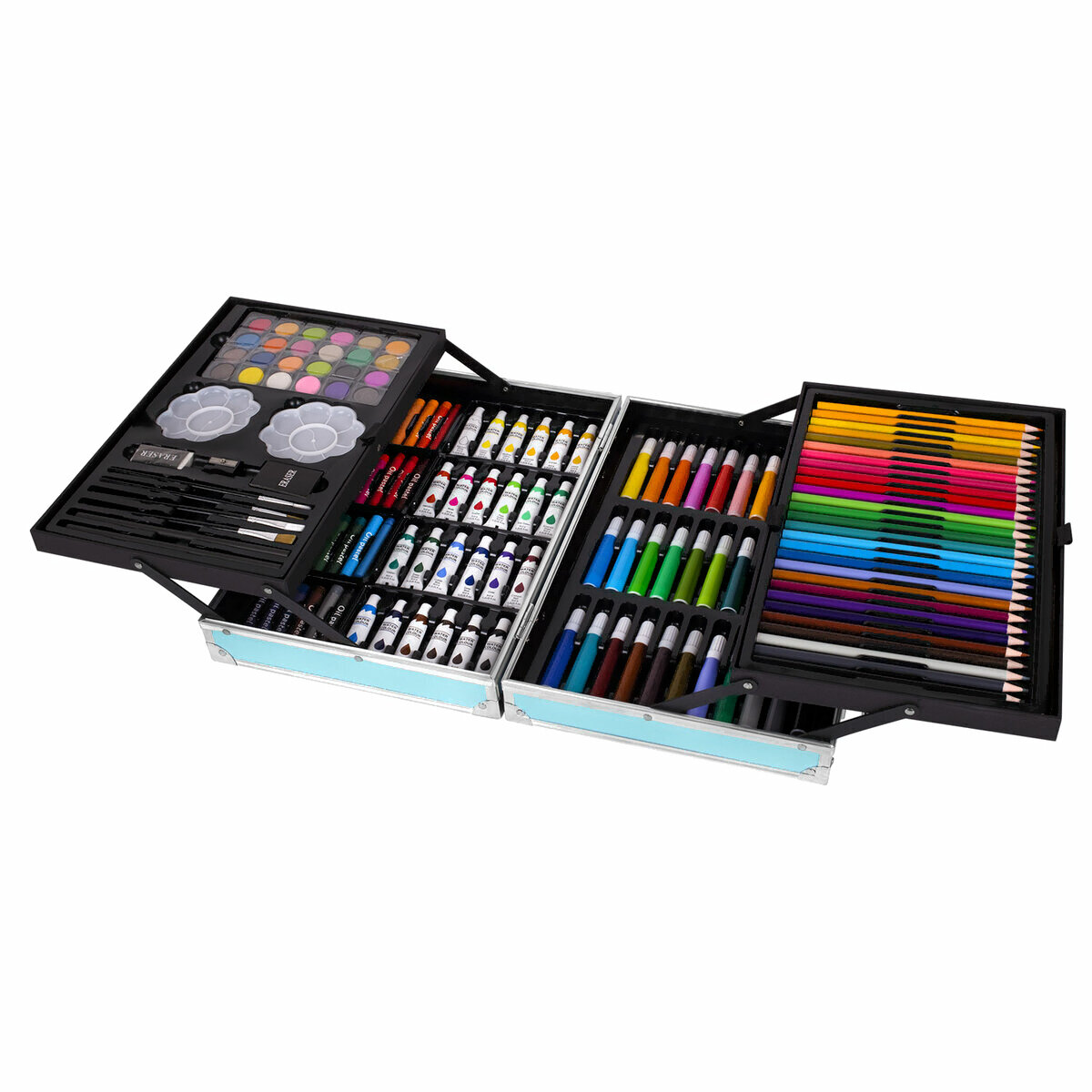 • Наполнение акварель (48), восковые мелки (24), карандаш чернографитный (2), карандаши цветные (28), кисть (4), краски, ластик (2), раскраска (5), точилка (1), палитра (2), наклейки/стикеры (15)
