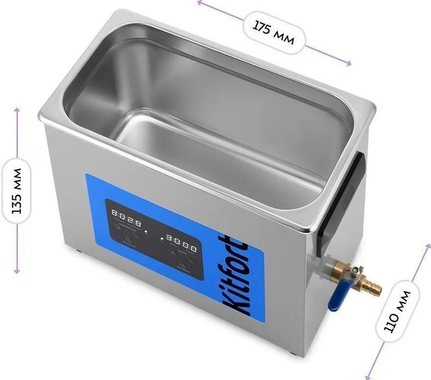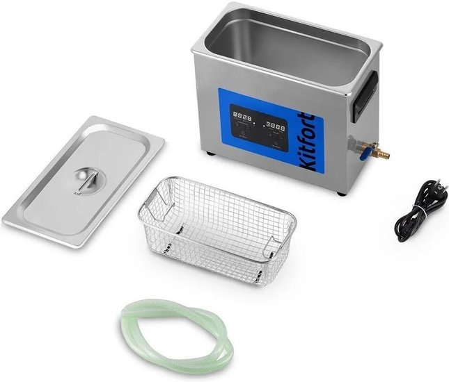 Для идеальной чистоты!Ультразвуковая мойка КТ-6472 эффективно очистит и продезинфицирует небольшие изделия из металла, пластика и стекла. Ультразвуковая очистка — способ очистки поверхности твёрдых тел в жидкости, при котором в жидкость вводятся ультразвуковые колебания.Удобство во всём!Корпус прибора, крышка, резервуар и корзина сделаны из нержавеющей стали. Крышка у прибора съёмная, что позволяет удобно загружать предметы в корзину. Устройство имеет большой резервуар — 4,8 литра. Это позволит Вам очистить большое количество предметов.Слив воды — не проблема!Для удобного слива воды или чистящего средства из резервуара предусмотрен кран и шланг. Вы можете расположить ультразвуковую мойку недалеко от раковины и провести шланг в неё или подставить под кран пустую ёмкость и открыть его.Настройка времени работы и температурыУправление прибором осуществляется при помощи кнопок на панели управления. Вы можете выбрать время работы 1-30 минут с шагом 1 минута, после которого мойка автоматически отключается. Также можно настраивать температуру нагрева воды 1-80 °C с шагом 1 °C.Проста в использованииНаполните мойку водой и положите в неё ювелирные украшения, зубные протезы, кисти для макияжа и прочее, а также включите прибор. Благодаря тщательной чистке удаляются даже самые въевшиеся загрязнения. Через пару минут ваши украшения заблестят вновь!Компактный размер устройстваБлагодаря небольшому размеру мойка не займёт много места у вас в доме. Главное преимущество ультразвуковой мойки — это возможность очищать предметы сложных форм. Ещё одним достоинством является быстрота процесса при его высокой эффективности.Полный комплектВсе части устройства разборные. Помимо самой мойки, крышки, шнура питания и шланга, в комплекте идёт корзина, которую необходимо устанавливать внутрь при работе прибора.Для идеальной чистоты!Ультразвуковая мойка КТ-6472 эффективно очистит и продезинфицирует небольшие изделия из металла, пластика и стекла. Ультразвуковая очистка — способ очистки поверхности твёрдых тел в жидкости, при котором в жидкость вводятся ультразвуковые колебания.Удобство во всём!Корпус прибора, крышка, резервуар и корзина сделаны из нержавеющей стали. Крышка у прибора съёмная, что позволяет удобно загружать предметы в корзину. Устройство имеет большой резервуар — 4,8 литра. Это позволит Вам очистить большое количество предметов.Слив воды — не проблема!Для удобного слива воды или чистящего средства из резервуара предусмотрен кран и шланг. Вы можете расположить ультразвуковую мойку недалеко от раковины и провести шланг в неё или подставить под кран пустую ёмкость и открыть его.Настройка времени работы и температурыУправление прибором осуществляется при помощи кнопок на панели управления. Вы можете выбрать время работы 1-30 минут с шагом 1 минута, после которого мойка автоматически отключается. Также можно настраивать температуру нагрева воды 1-80 °C с шагом 1 °C.Проста в использованииНаполните мойку водой и положите в неё ювелирные украшения, зубные протезы, кисти для макияжа и прочее, а также включите прибор. Благодаря тщательной чистке удаляются даже самые въевшиеся загрязнения. Через пару минут ваши украшения заблестят вновь!Компактный размер устройстваБлагодаря небольшому размеру мойка не займёт много места у вас в доме. 