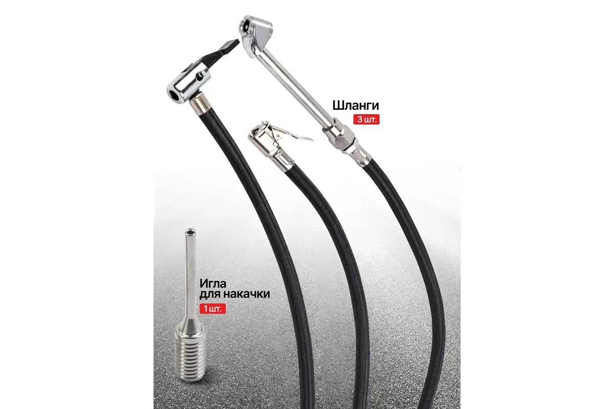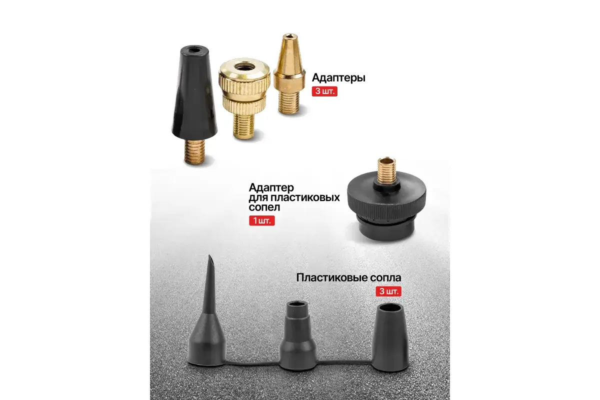 • Дополнительная комплектация сопло (3 шт.), адаптер (4 шт.), шланг (3 шт.), шланговый наконечник (3 шт.), насадка (игла)