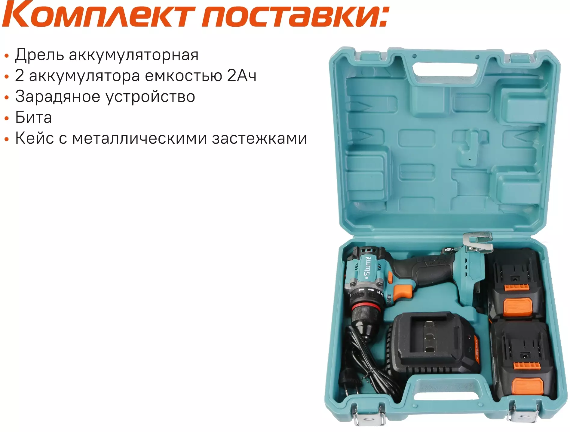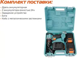 • Комплект поставки Дрель-шуруповерт, аккумуляторная батарея (2 шт.), зарядное устройство, двусторонняя бита, инструкция по эксплуатации, инструкция по безопасности, кейс.