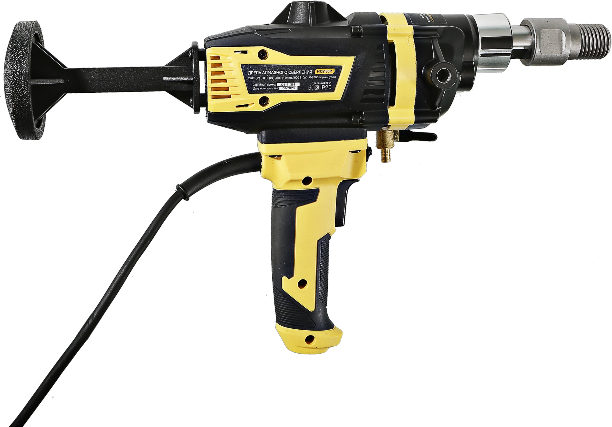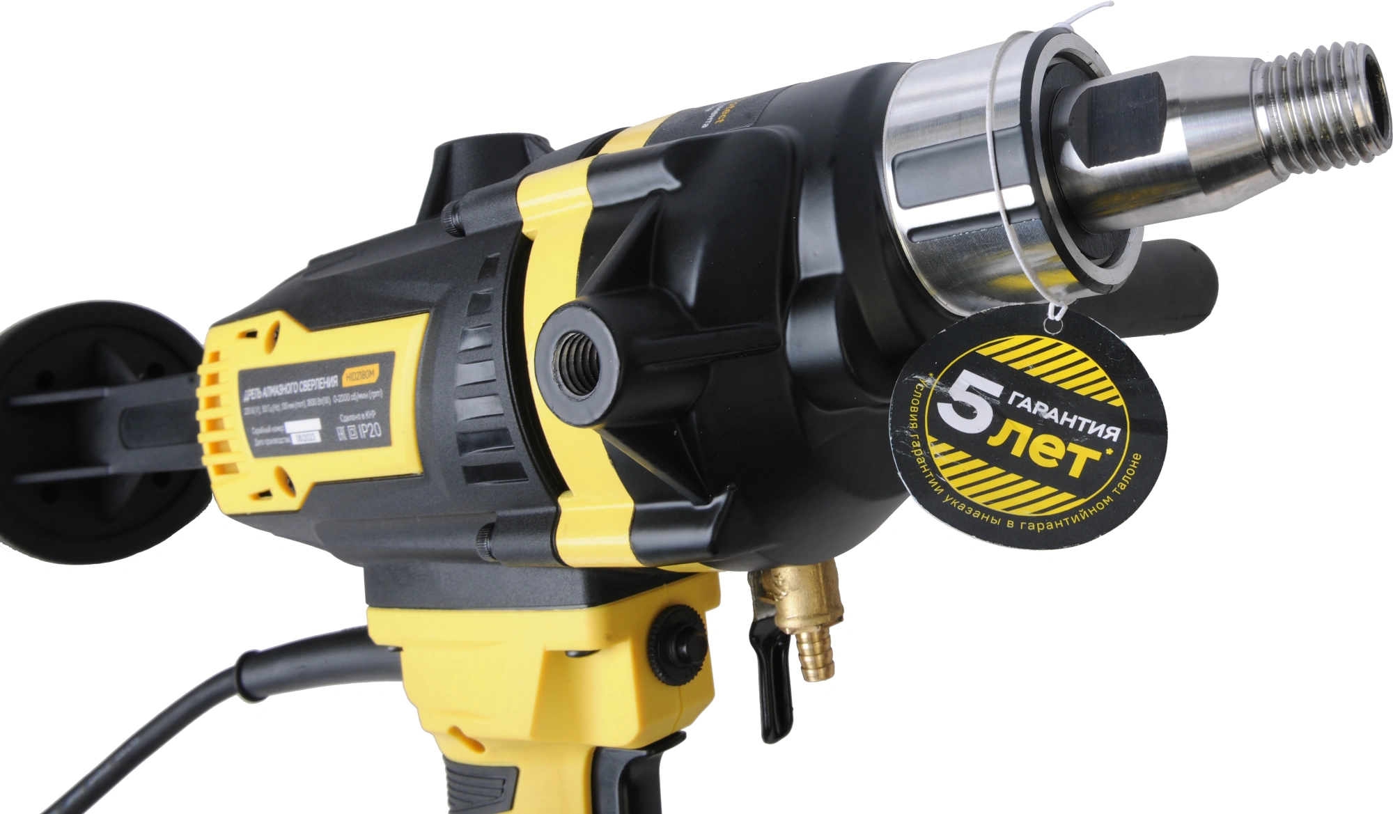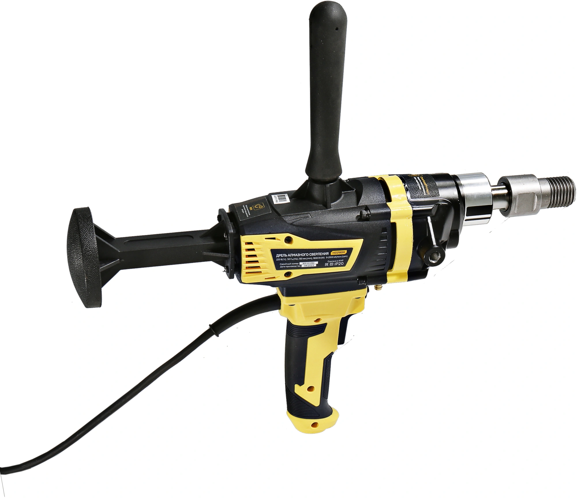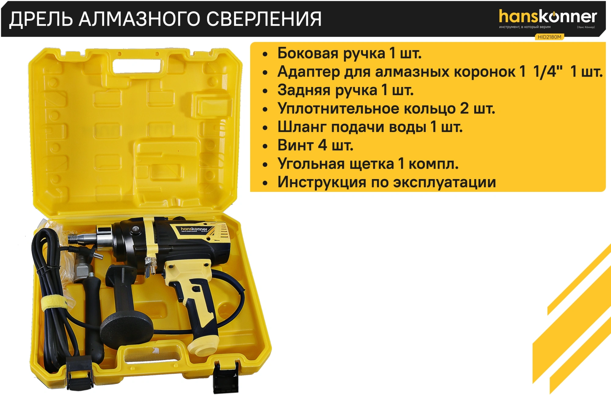 • Комплект поставки Дрель безударная, боковая ручка, адаптер для алмазных коронок 1 1/4", задняя ручка, уплотнительное кольцо - 2 шт., шланг подачи воды, винт - 4 шт., угольная щетка 1 компл., инструкция по эксплуатации, инструкция по безопасности.