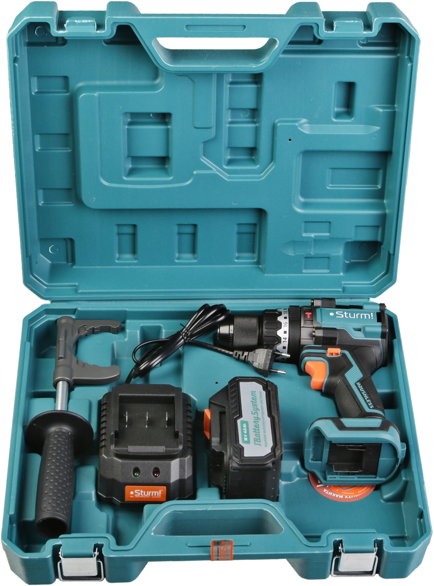 • Комплект поставки Дрель ударная, аккумуляторная батарея, зарядное устройство, вспомогательная рукоятка, инструкция по эксплуатации, инструкция по безопасности.