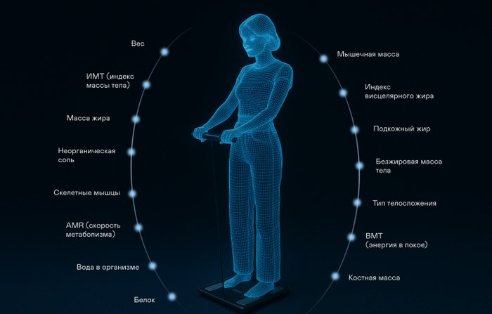 • Функциональные особенности расчет доли воды, расчет доли жировой ткани, расчет доли мышечной ткани, расчет доли костной ткани, расчет ИМТ (BMI), расчет уровня белка, расчет висцерального жира