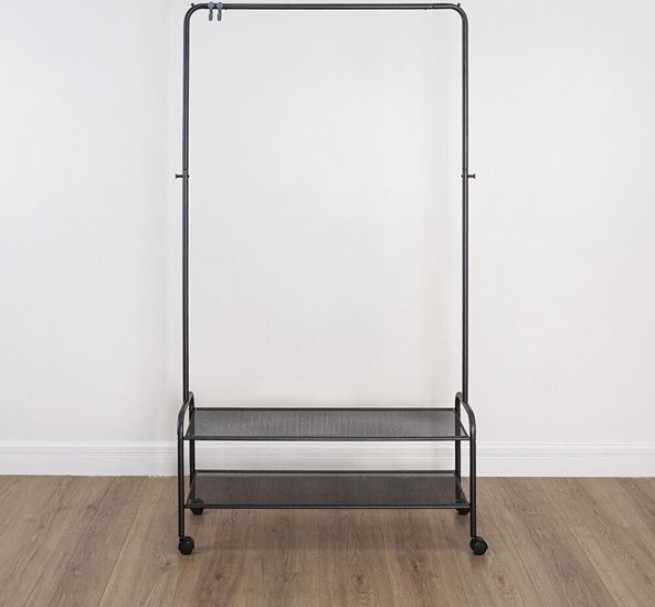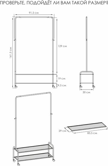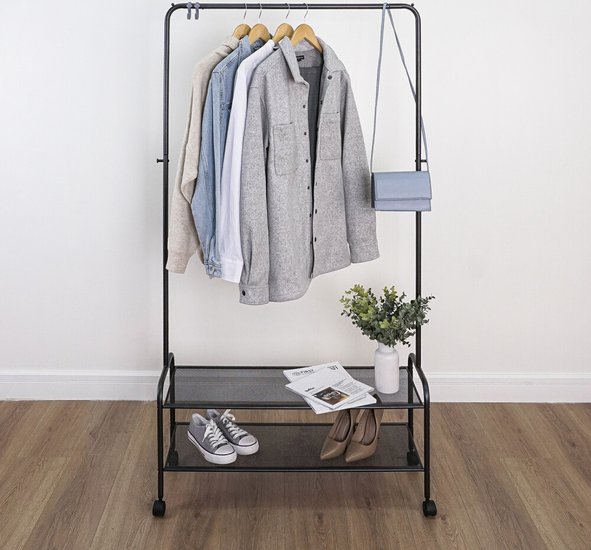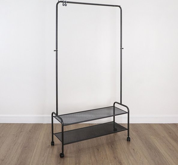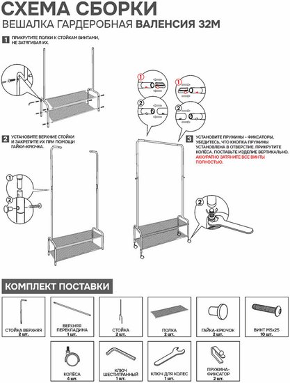 Стильная стойка для одежды «Валенсия 32М» создана для хранения одежды и обуви. Благодаря своему дизайну и многофункциональности она отлично впишется в любой интерьер. Ее можно использовать в гардеробе, в спальне, в прихожей. Долговечная, благодаря корпусу из стали, покрытому полимерно-порошковым покрытием. Вешалка вмещает порядка 15 плечиков, а ограничители не дадут им соскользнуть на пол. Перекладина выдерживает нагрузку до 20 кг. На двух сетчатых полках с легкостью помещается до 8 пар обуви. С помощью колесиков вешалку удобно перемещать по комнате. На боковых стойках предусмотрены стильные металлические крючки для хранения сумок и прочих предметов. Максимально простая сборка, инструменты в комплекте. Изделие в цветной картонной упаковке с удобной ручкой.Стильная стойка для одежды «Валенсия 32М» создана для хранения одежды и обуви. Благодаря своему дизайну и многофункциональности она отлично впишется в любой интерьер. Ее можно использовать в гардеробе, в спальне, в прихожей. Долговечная, благодаря корпусу из стали, покрытому полимерно-порошковым покрытием. Вешалка вмещает порядка 15 плечиков, а ограничители не дадут им соскользнуть на пол. Перекладина выдерживает нагрузку до 20 кг. На двух сетчатых полках с легкостью помещается до 8 пар обуви. С помощью колесиков вешалку удобно перемещать по комнате. На боковых стойках предусмотрены стильные металлические крючки для хранения сумок и прочих предметов. Максимально простая сборка, инструменты в комплекте. Изделие в цветной картонной упаковке с удобной ручкой.