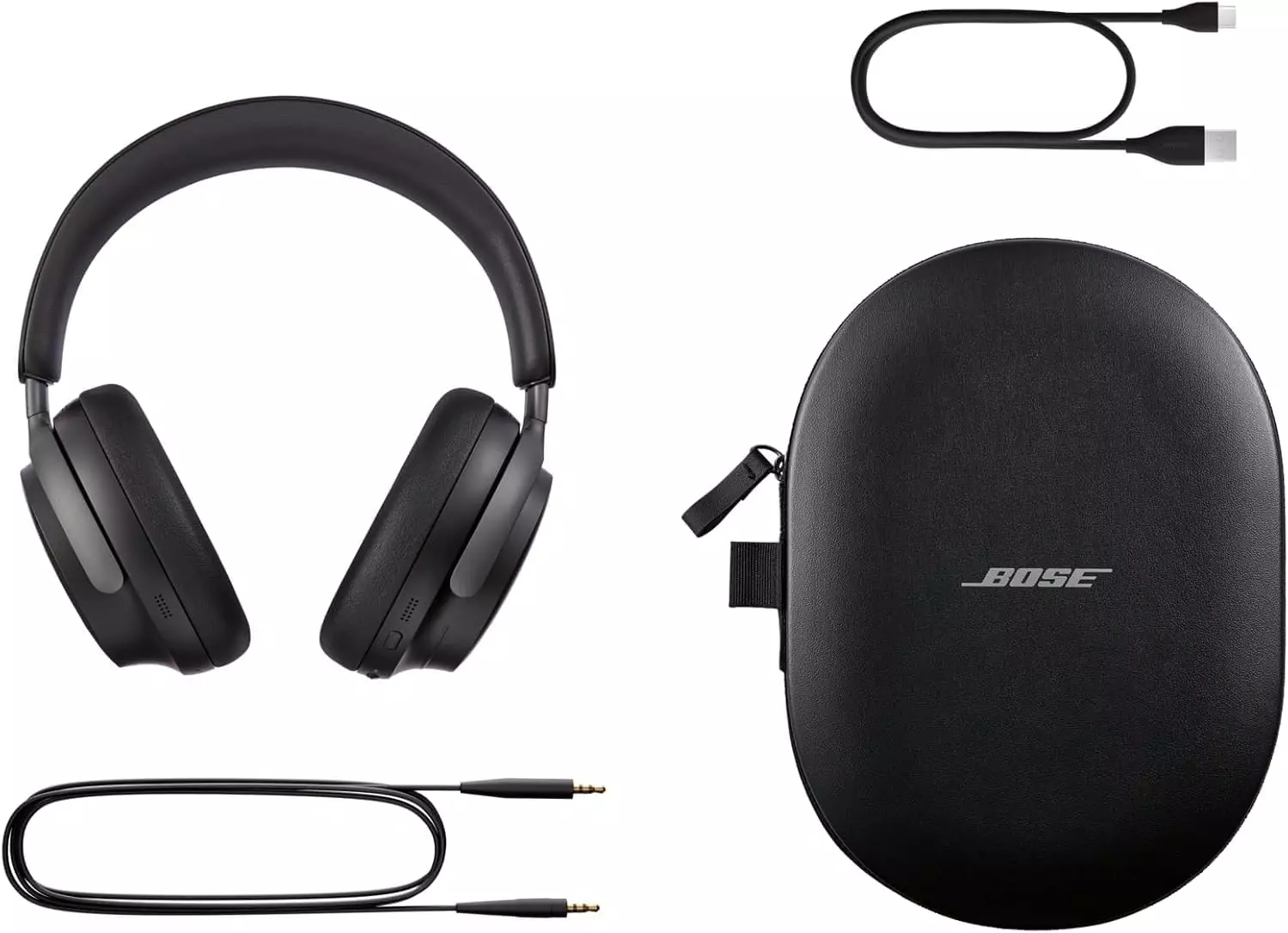 • Комплектация Наушники Bose QuietComfort Ultra, Чехол для переноски, Аудиокабель 3,5 мм - 2,5 мм, Кабель USB-C (A–C), Паспорт безопасности