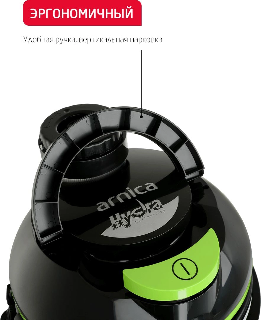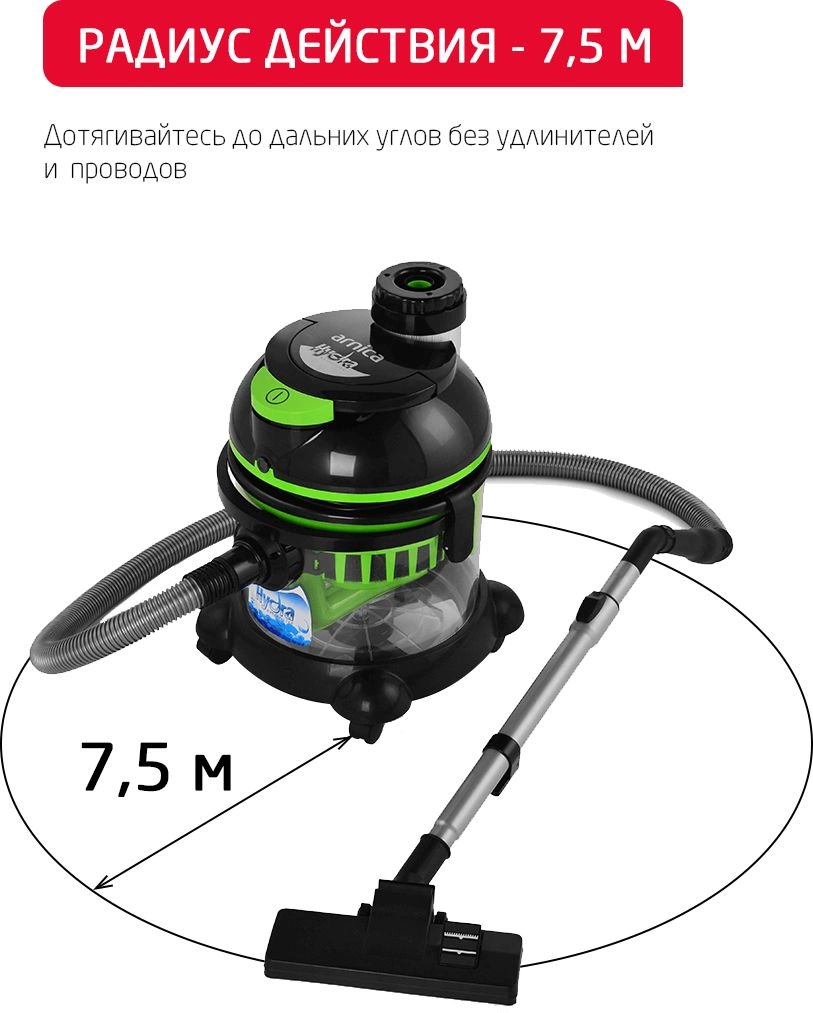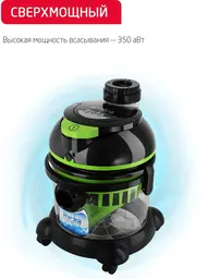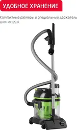 • Особенности пылесоса легко очищаемый пылесборник, место для хранения насадок, настенное крепление, поворачивающиеся колеса, шланг