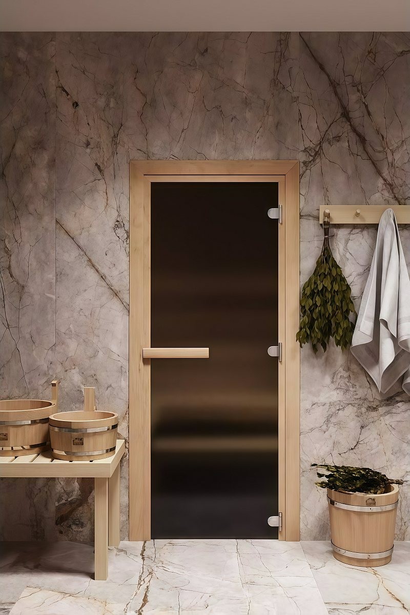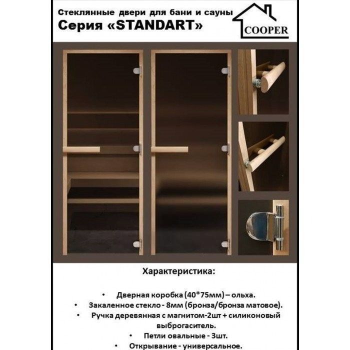 Дверь стеклянная для бани Cooper STANDART 1900х800 Бронза матовая (коробка ольха) с прямоугольной ручкой на магнитной защелке, крепится горизонтально. Дверь универсальная: может быть как правосторонней, так и левосторонней. Наличников в комплекте нет.
