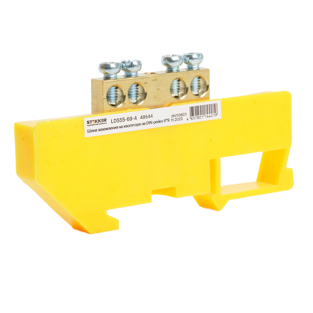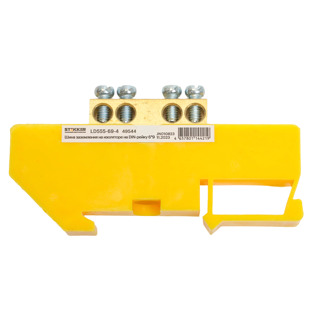 Шина"PE" на изоляторе STEKKER 6*9 на DIN-рейку 4 вывода, желтый, LD555-69-4 49544