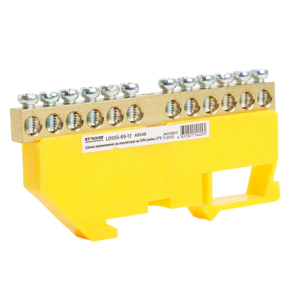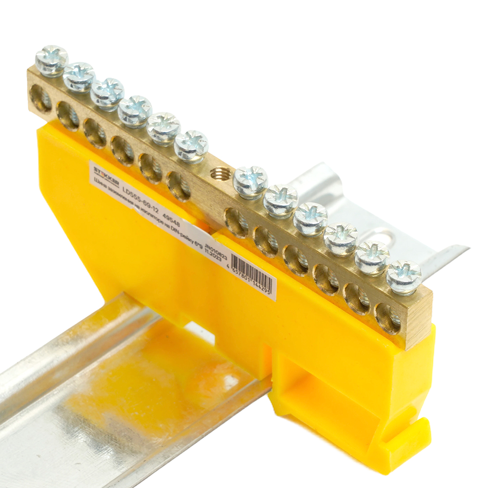 LD555-69-12 Шина "PE" на изоляторе 6*9на DIN-рейку 12 выводов, желтый