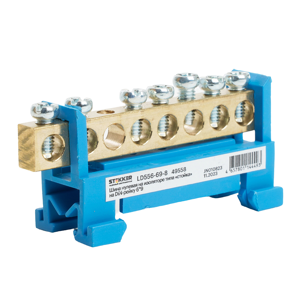 Шина "N" на изоляторе STEKKER 6*9 тип "стойка" на DIN-рейку 8 выводов, синий, LD556-69-8 49558