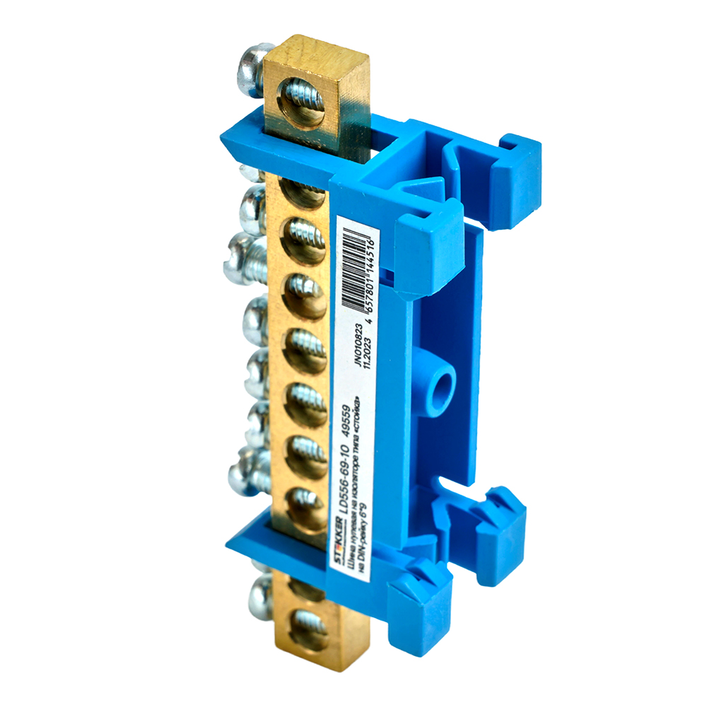 Шина "N" на изоляторе STEKKER 6*9 тип "стойка" на DIN-рейку 10 выводов, синий, LD556-69-10 49559