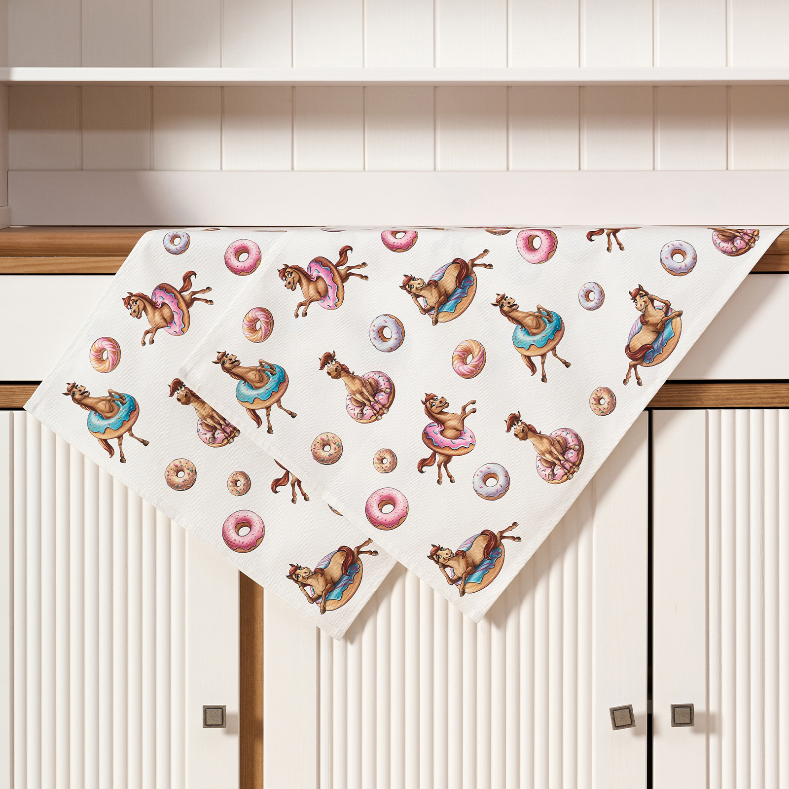 Набор кухонных полотенец с авторским принтом «Лошадь в пончиках» от бренда Lefard — яркий и праздничный акцент для кухни, символ наступающего года и забавный сувенир.
