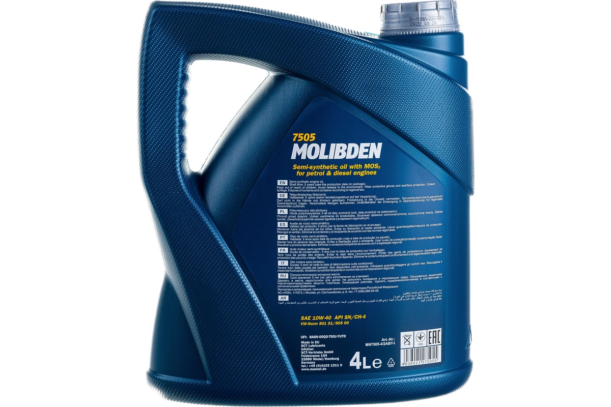 Полусинтетическое моторное масло MANNOL MOLIBDEN 10W40, 4 л 75054 - универсальное моторное масло на гидросинтетической основе, специально разработанное для всех типов бензиновых и дизельных двигателей, в том числе тяжелонагруженных. Содержит органический и неорганический молибден (MoS2). Предназначено для бензиновых и дизельных двигателей широкого парка автомобилей (легковых, легких внедорожников, микроавтобусов и легких грузовиков) европейских и других производителей, особенно рекомендовано для автомобилей «старых» марок и с большим пробегом. Внимание! Не рекомендуется смешивать со стандартными моторными маслами. Масло не предназначено для использования в тяжелых грузовиках и иной подобной технике. Полусинтетическое моторное масло MANNOL MOLIBDEN 10W40, 4 л 75054 имеет гидросинтетическую основу, которая обеспечивает эффективную эксплуатацию двигателя на всех режимах работы: при холодном пуске, в городском режиме и в режиме трассы; Содержит органический и неорганический молибден, обеспечивающий уникальные антифрикционные и противозадирные свойства. Эффективно снижает износ на всех режимах работы двигателя за счет формирования на сопряженных поверхностях трения уникальной защитной пленки, выдерживающей экстремальные нагрузки. Исключает задиры; Содержит эффективный набор антиоксидантов за счёт чего эффективно сопротивляется старению; Гидросинтетическая основа в сочетании современным пакетом присадок сохраняет мощностные параметры двигателя на протяжении всего интервала между заменами и сохраняет стабильность вязкости в течение всего срока эксплуатации; Имеет низкие потери на «угар».