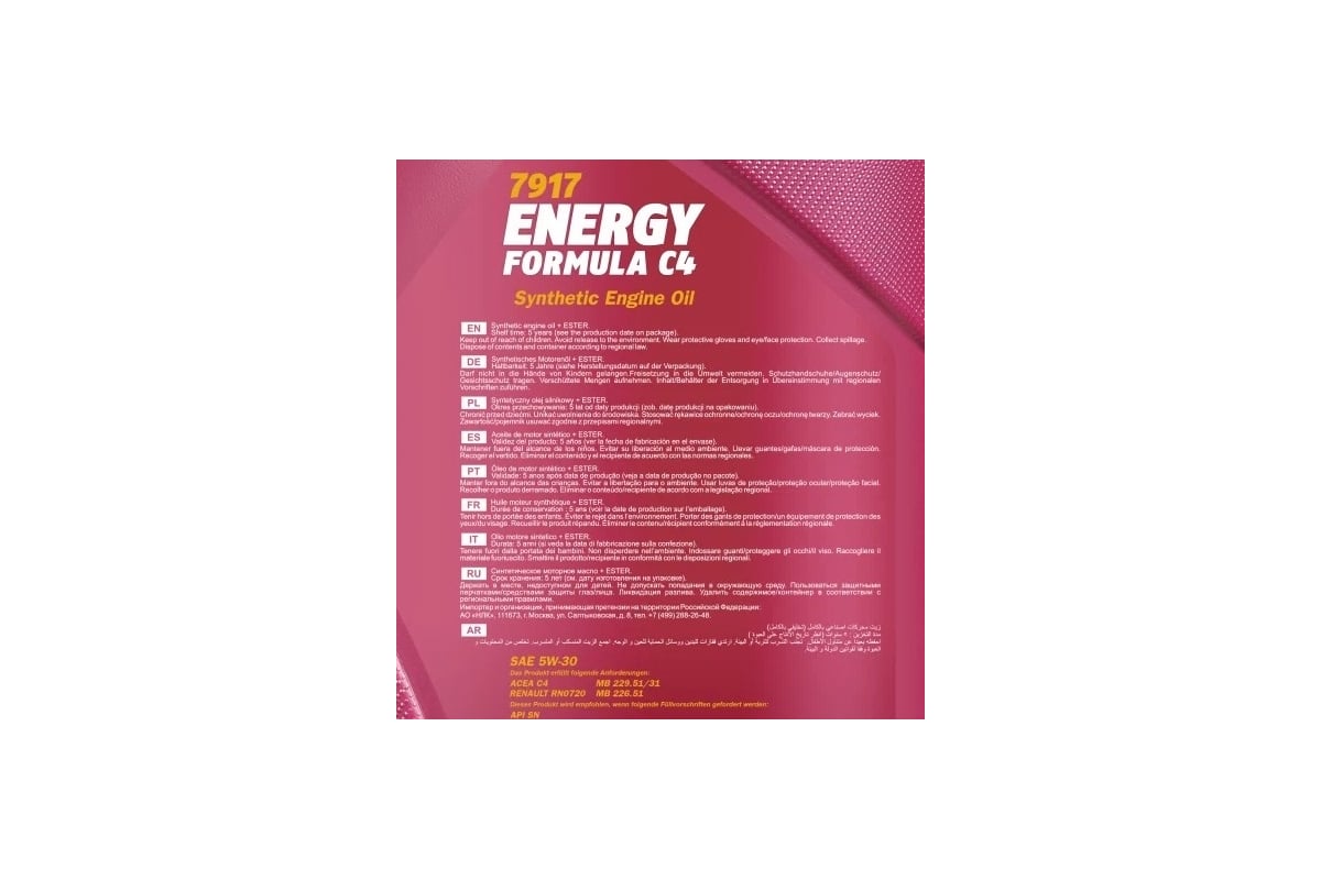 Моторное масло MANNOL ENERGY FORMULA синтетическое, C4, 5W-30, 5 л 79175 - инновационное универсальное ester-содержащее полностью синтетическое моторное масло премиум-класса для современных дизельных и бензиновых двигателей с турбонаддувом и без, оборудованных сажевыми фильтрами (DFP/FAP). Продукт разработан специально для профессионального технического обслуживания автомобилей Renault.