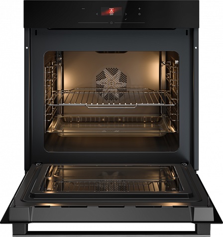 Особенности дизайна и внешней панели управления — также важный пункт при выборе духовки на кухню. В данной модели нужно обратить внимание на цвет — черное стекло, охлаждение двери, чтобы поверхность и мебель вокруг не нагревались.