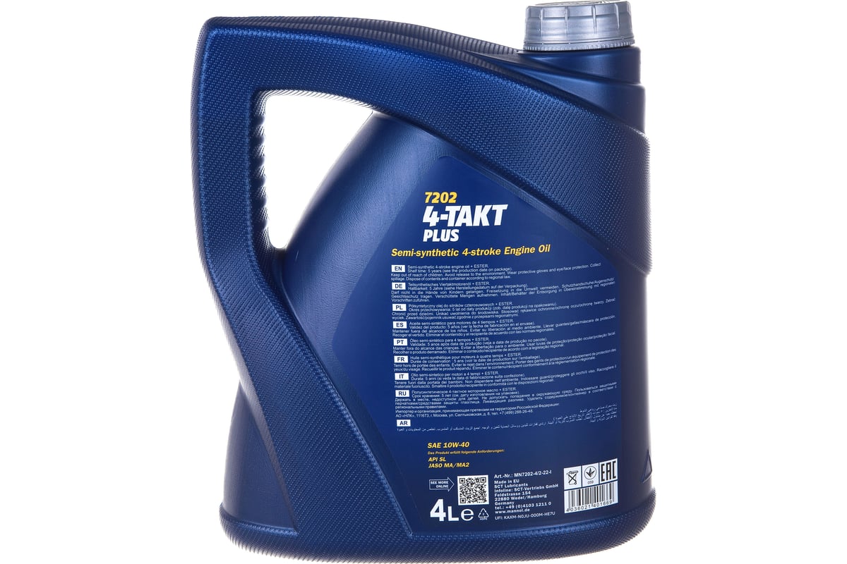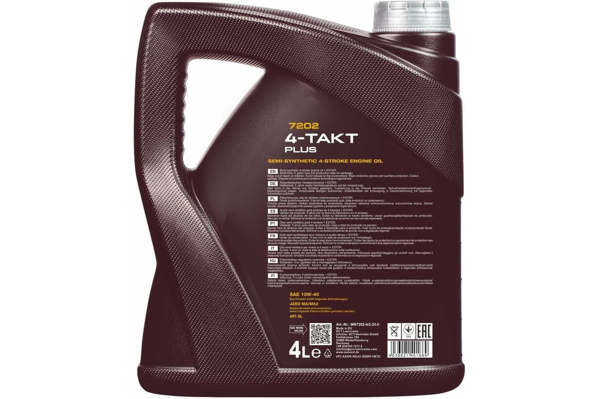 Масло моторное полусинтетическое 4-TAKT PLUS 10W40 4 л 10W-40 MANNOL 1425 - высококачественное моторное масло на синтетической основе содержащей эстеры для современных 4-х тактных двигателей мототехники с интегрированной и неинтегрированной КПП и со сцеплением в масляной ванне, с воздушным и жидкостным охлаждением. Допускается применение в двигателях с «сухим сцеплением». Разработано для гарантированной защиты двигателя и обеспечения долговечности КПП.