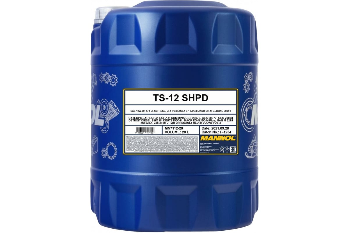 Полусинтетическое моторное масло MANNOL TS-12 SHPD 10W30, 20 л 1521 - всесезонное полусинтетическое (HC synthesis) моторное масло для современных высоконагруженных и высокооборотистых дизельных двигателей с турбоннаддувом и без, работающих в тяжелых условиях. Разработано специально, чтобы обеспечить защиту техники и получить от неё максимальную отдачу вне зависимости от условий её эксплуатации. Предназначено для всех видов высоконагруженных дизельных двигателей шоссейной (магистральные тягачи, автобусы и т.д.), внедорожной (строительная, горнодобывающая, сельскохозяйственная) и специальной техники российских, европейских, американских и азиатских производителей, соответствующих требованиям Euro I, II, III, IV, V где необходим уровень эксплуатационных свойств CG-4 или ниже. Может быть использовано в бензиновых двигателях, где необходим уровень эксплуатационных свойств API SL или ниже. Полусинтетическое моторное масло MANNOL TS-12 SHPD 10W30, 20 л 1521 обеспечивает отличные антифрикционные, противоизносные и противозадирные свойства, что значительно продлевает ресурс техники на всех, даже самых экстремальных, режимах работы в широком диапазоне температур окружающей среды и обеспечивает существенную экономию топлива; Синтетические компоненты в сочетании с природными антиоксидантами придают маслу повышенную термоокислительную стабильность, что в сочетании с превосходными моюще-диспергирующими свойствами (TBN >10) и пониженной зольностью эффективно снижает нагаро- и лакообразование, предотвращает образование отложений всех видов и поддерживает в исключительной чистоте детали двигателя на протяжении всего интервала между заменами; Уникальная гидросинтетическая рецептура обеспечивает маслу стойкость к старению, а за счет пониженной испаряемости и повышенной температуры вспышки снижает расход масла «на угар», что позволяет применять его в двигателях с увеличенным интервалом замены масла (Long Life- до 30 000 км) и обычных; За счёт гидросинтетической основы оптимальной вязкости обладает отличными низкотемпературными свойствами, в том числе низкой температурой застывания, что обеспечивает превосходную прокачиваемость масла и проворачиваемость узлов двигателя при низких температурах, лёгкий «холодный пуск» (до -30ºC) и снижение пускового износа; Эффективно защищает детали двигателя от всех видов коррозии, а уплотнения от разъедания кислотами; - Имеет пониженное пенообразование; Эффективно борется с увеличением усилия сдвига в процессе эксплуатации, вызванного ростом вязкости за счёт дисперcии сажи; Специальный пакет присадок разработан с учетом сложных российских условий эксплуатации и низкого качества топлива.
