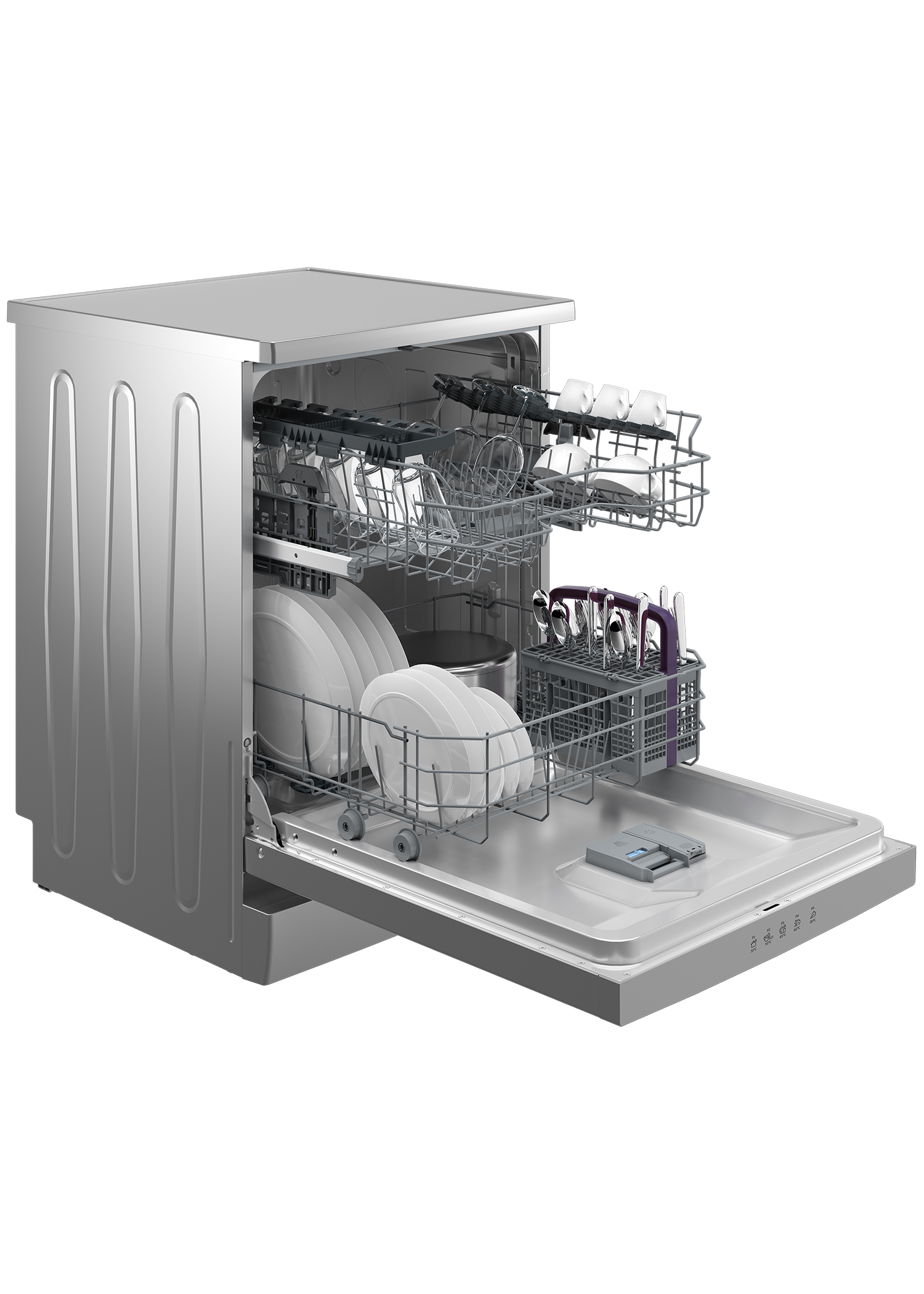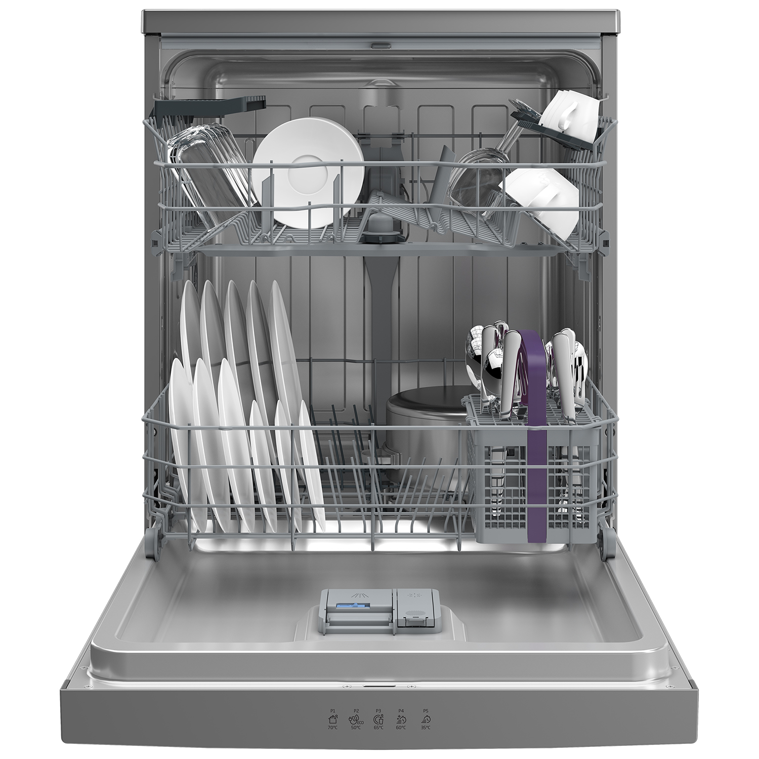 Стильная серебристая посудомоечная машина на 14 комплектов посуды. Легко поместится на кухне благодаря стандартной ширине 60 см. Имеет 5 основных программ мытья, функцию половинной загрузки и возможность отложить старт программы на 3, 6 или 9 часов. Специальные световые индикаторы вовремя предупредят о протечке, отсутствии соли или ополаскивателя, а встроенная система смягчения воды позволяет избежать появления известкового налета. Имеет кнопочную панель управления и LED дисплей.
