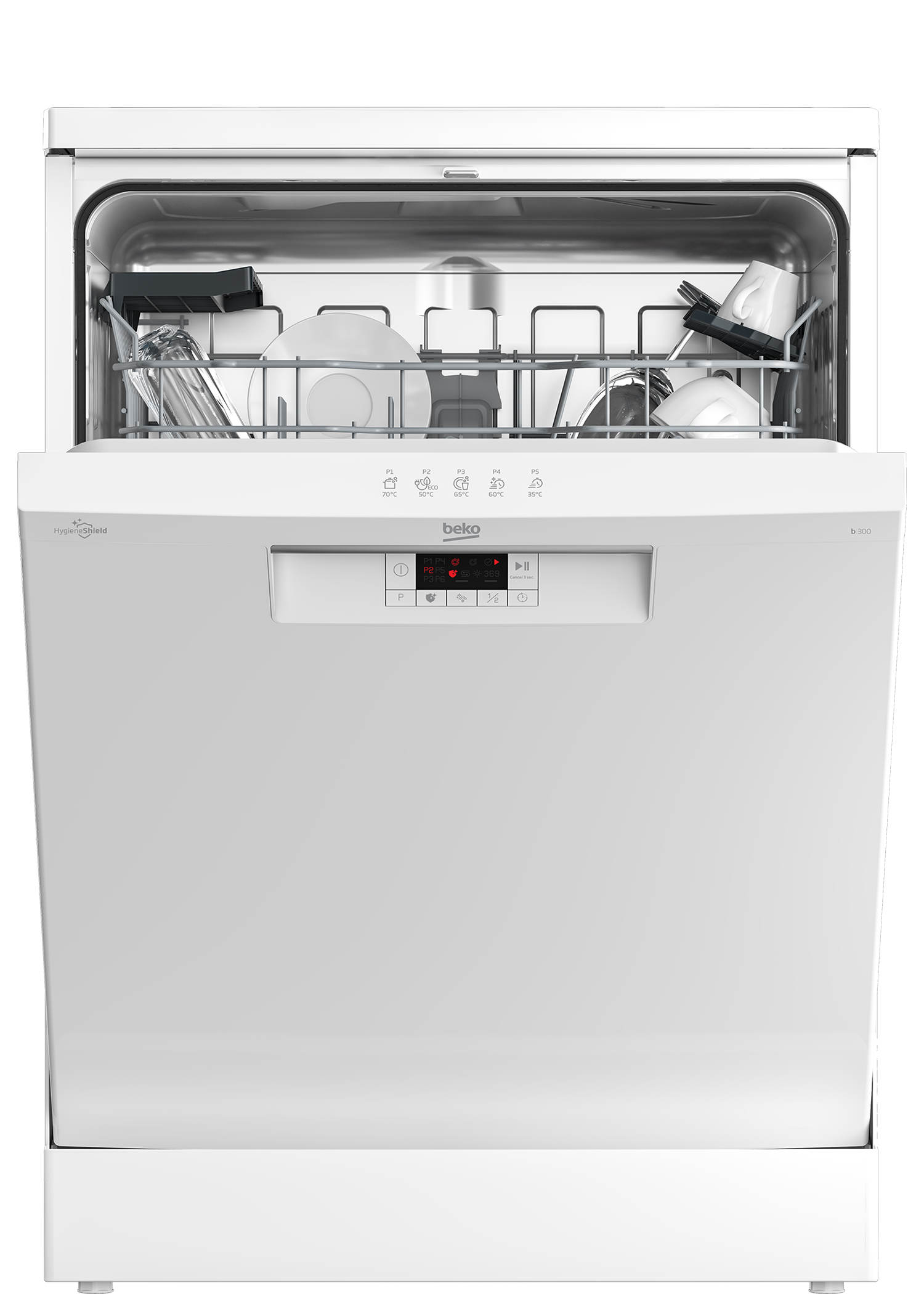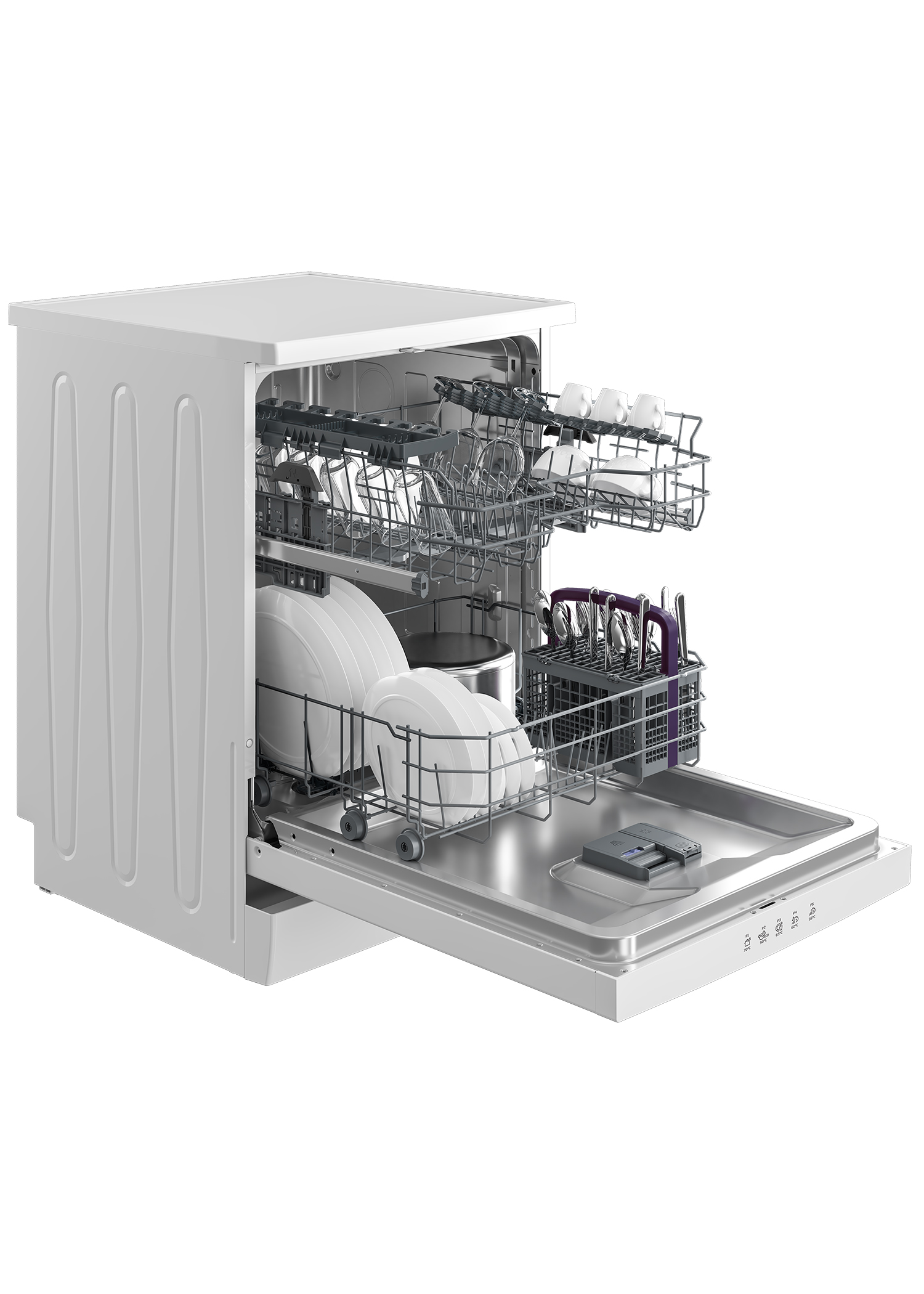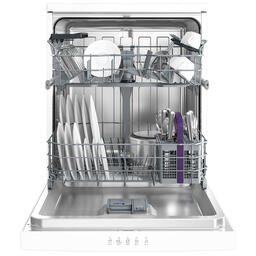 Белая посудомоечная машина с кнопочной панелью управления и LED дисплеем. Вмещает 14 комплектов посуды при стандартной ширине 60 см. Имеет 5 встроенных программ мытья и функцию отложенного старта через 3, 6 или 9 часов. Поддерживает половинную загрузку — режим для мытья небольшого количества посуды со сниженным расходом электричества и воды. Встроенная система смягчения воды позволяет избежать появления известкового налета, а световые индикаторы вовремя предупредят о протечке, отсутствии соли или ополаскивателя.