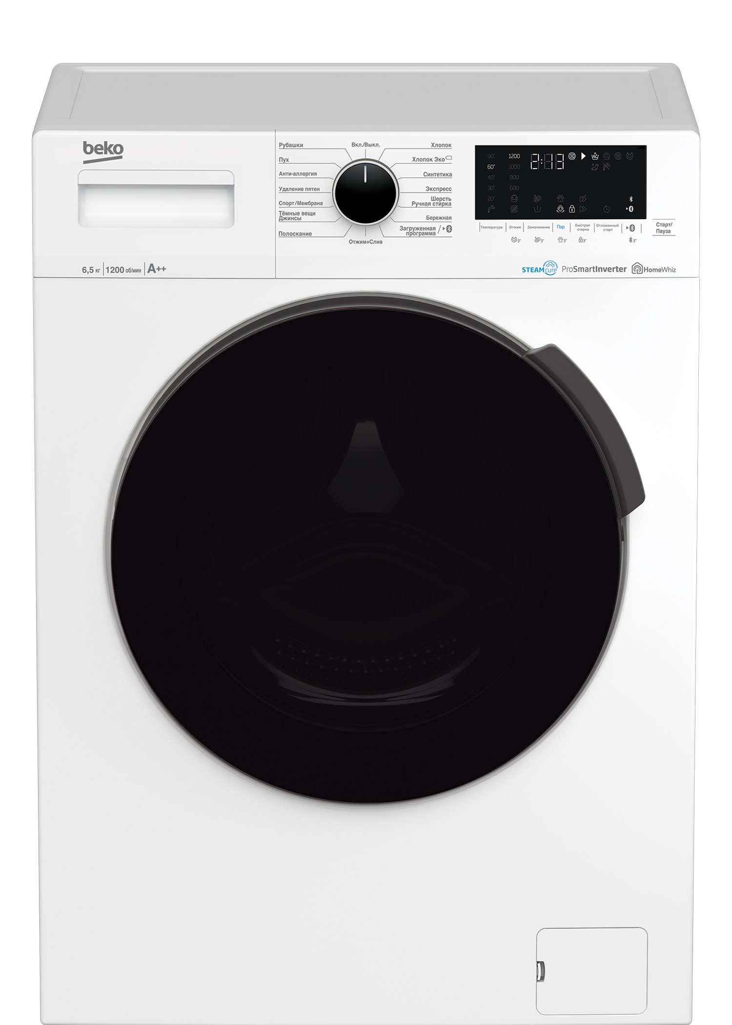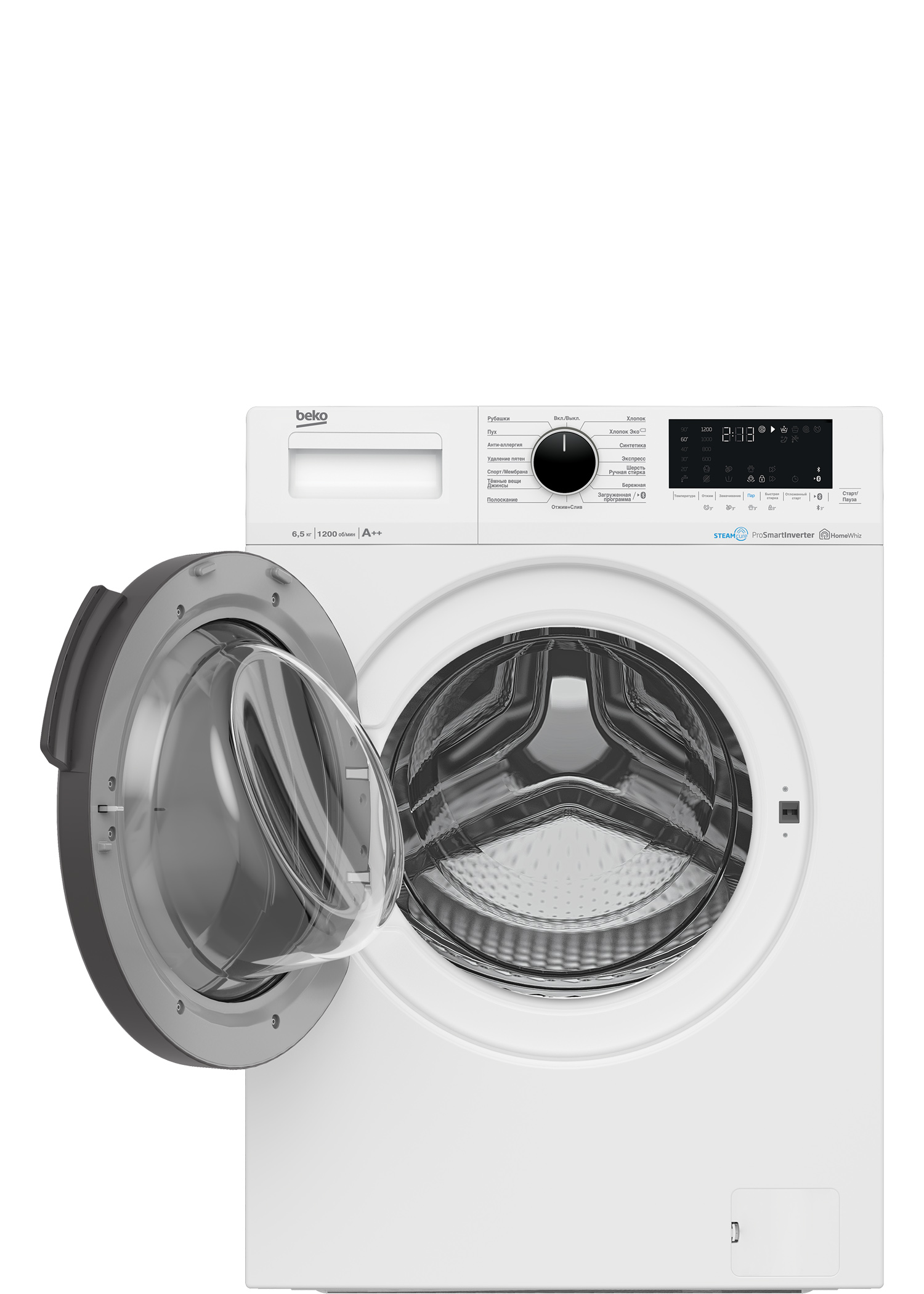Стильная и элегантная стиральная машина с премиальным темным люком и сенсорным дисплеем оснащена инверторным мотором ProSmart и нагревательным элементом Hi-Tech с защитой от накипи. Стиральная машина имеет максимальную загрузку барабана 6,5 кг и предлагает 15 программ стирки для разных типов ткани и одежды, включая шерсть, спортивную одежду и пуховики, гипоаллергенную стирку и быструю стирку за 14 минут. Технология SteamCure в стиральной машине Beko обрабатывает вещи паром до цикла стирки для лучшего удаления пятен и после отжима для разглаживания тканей. Беспроводное управление HomeWhiz позволяет включать и следить за работой стиральной машины с вашего смартфона или планшета.