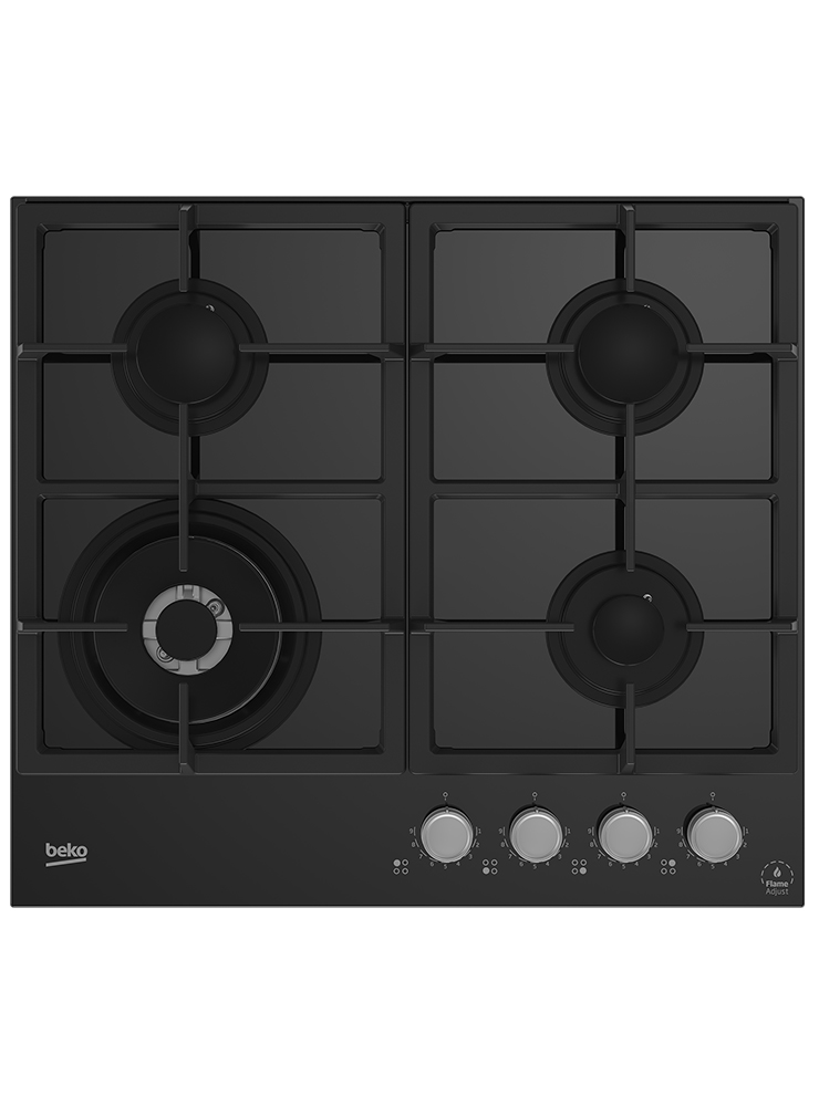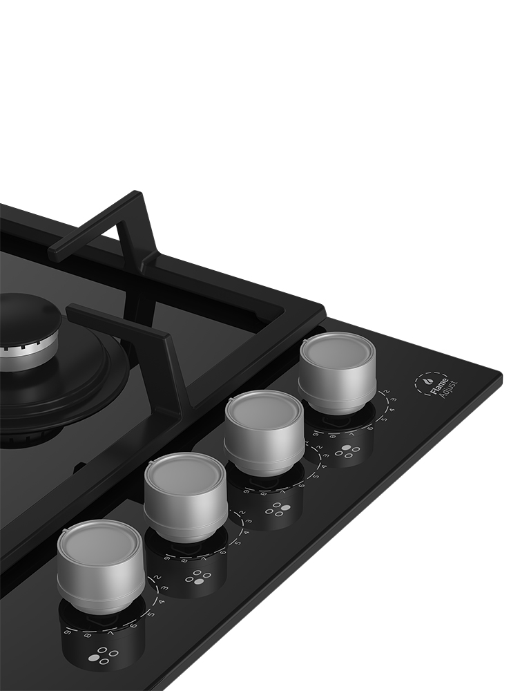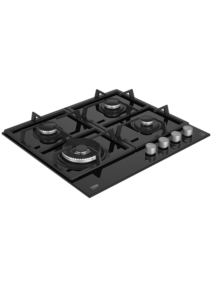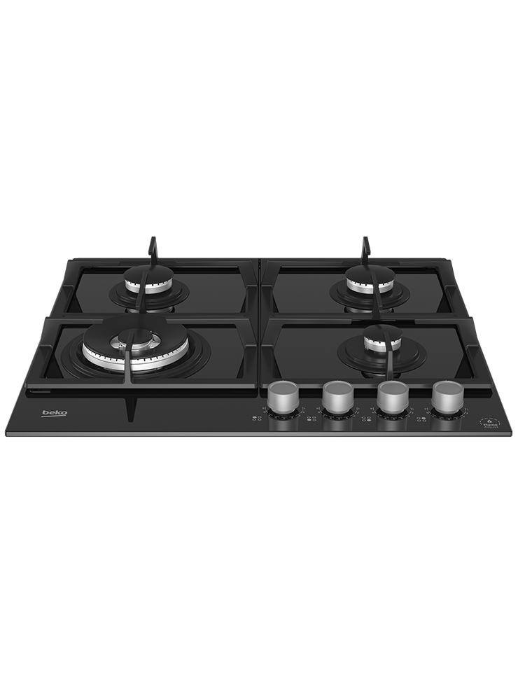Черная встраиваемая газовая панель с удобным механическим управлением и 4 высокоэффективными конфорками. Поверхность панели выполнена из стекла, решетки – чугунные. В регуляторы силы пламени встроен автоматический электроподжиг. Панель оснащена газ-контролем, который автоматически прекратит подачу газа в случае затухания огня из-за сквозняка или пролитой жидкости.