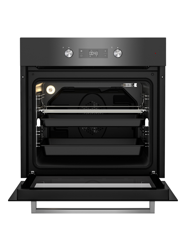 Встраиваемый духовой шкаф цвета графит имеет яркий сенсорный дисплей и удобное механическое управление с утапливаемыми переключателями, объем 71 л и телескопические направляющие. Духовка предлагает 8 режимов работы, включая равномерное 3D-приготовление, гриль и функцию разморозки, которая позволяет быстрее разморозить продукты перед приготовлением. Функция паровой очистки и каталитическое покрытие стенок облегчают уход за духовкой после каждого использования.