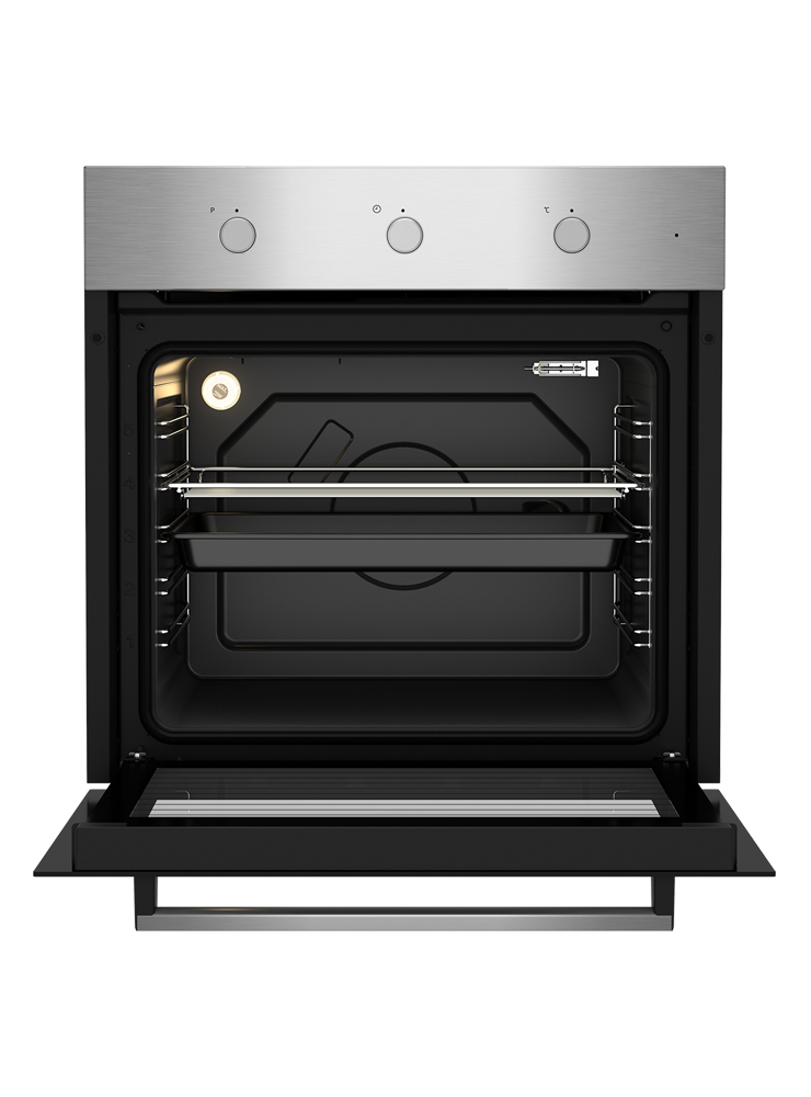 Встраиваемый духовой шкаф статического типа имеет объем 77 л и класс энергоэффективности А. Панель управления духовки оснащена утапливаемыми переключателями для выбора режимов работы и температуры и установки таймера. Духовой шкаф предлагает 4 режима работы, включая гриль, и имеет 5 уровней направляющих для противней. В комплекте с духовкой идут стандартный противень и решетка.