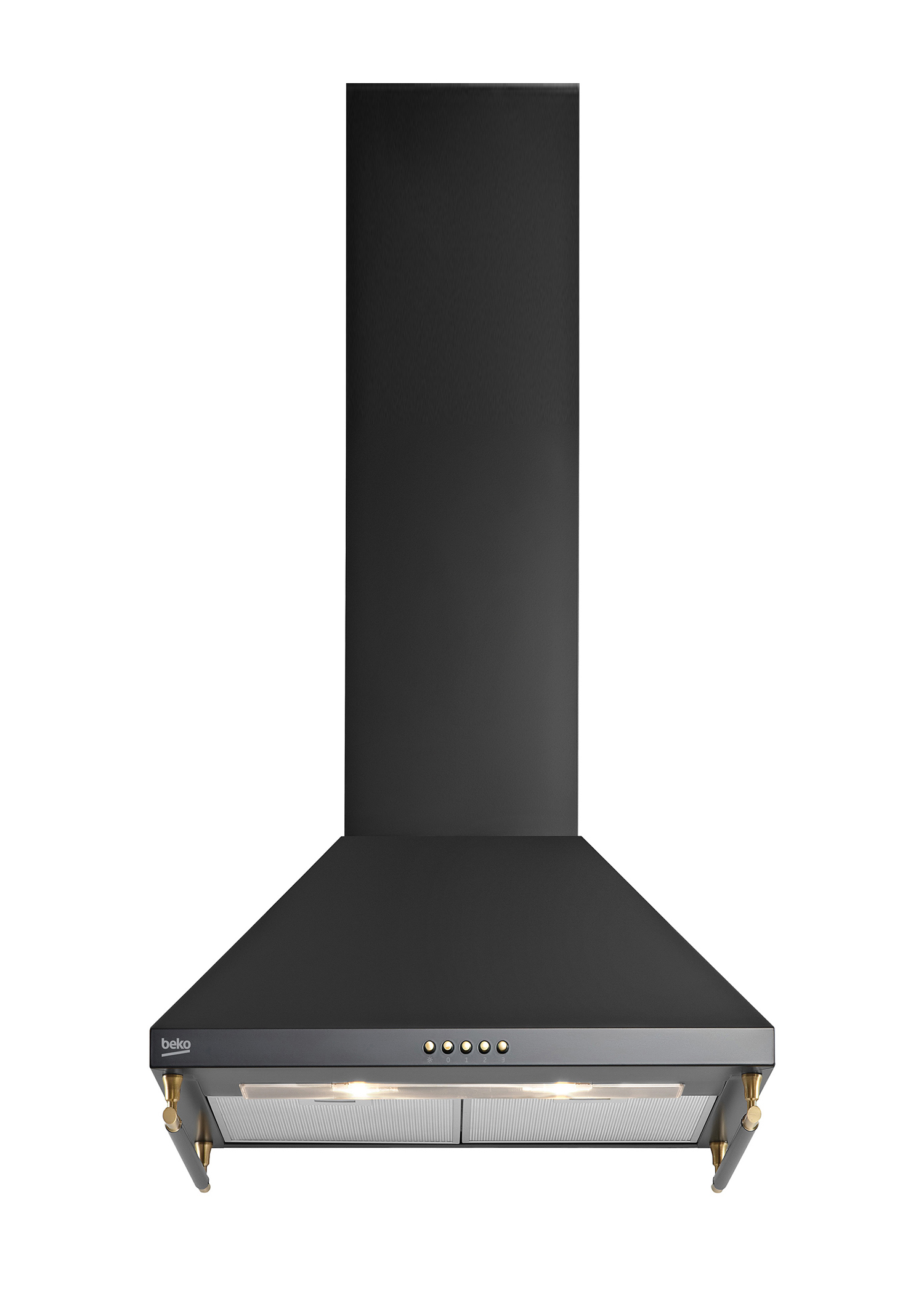 Вытяжка каминного типа выполнена в цвете антрацит и стиле рустик, имеет удобное кнопочное управление и яркую подсветку. При ширине 60 см вытяжка оснащена 2 металлическими фильтрами, которые улавливают жир, и дополнительным местом для угольного фильтра. Металлические фильтры вытяжки легко снять и можно мыть в посудомоечной машине.