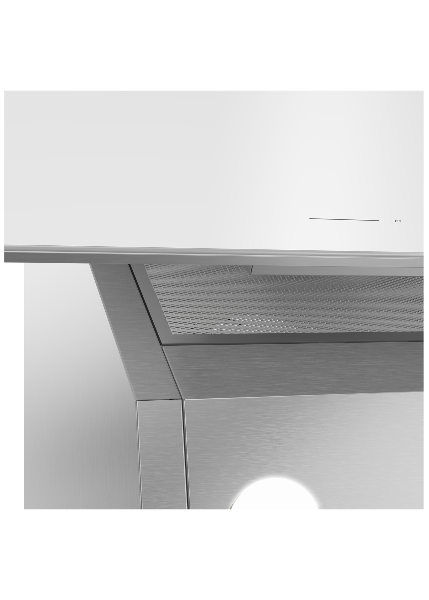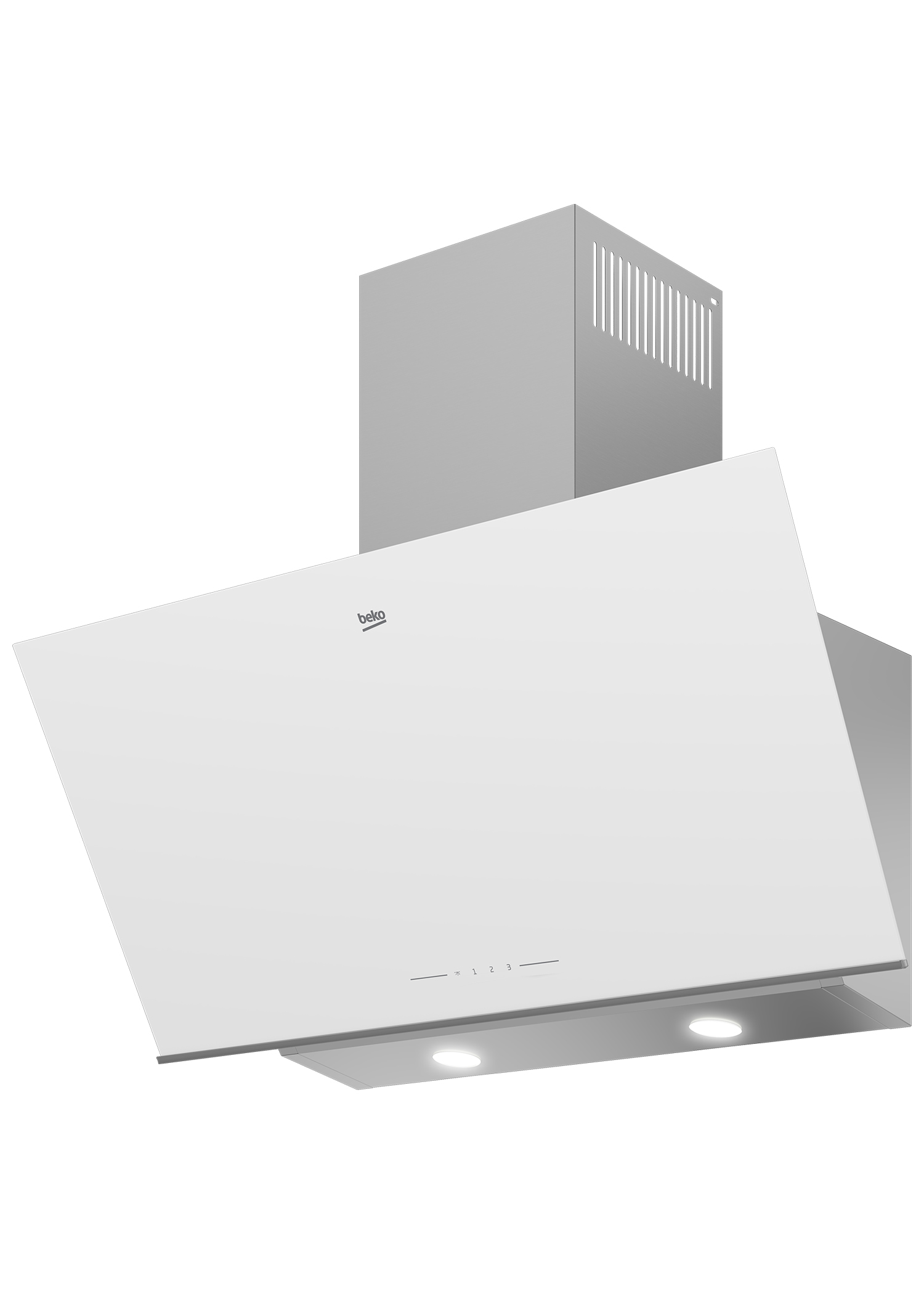 Наклонная вытяжка каминного типа выполнена в элегантном белом цвете, имеет ширину 90 см, удобное электронное управление и яркую LED-подсветку. Вытяжка работает в режиме рециркуляции воздуха и оснащена 2 фильтрами, которые улавливают частицы жира во время готовки, а также угольным фильтром, который очищает воздух на кухне от запахов еды и дыма.