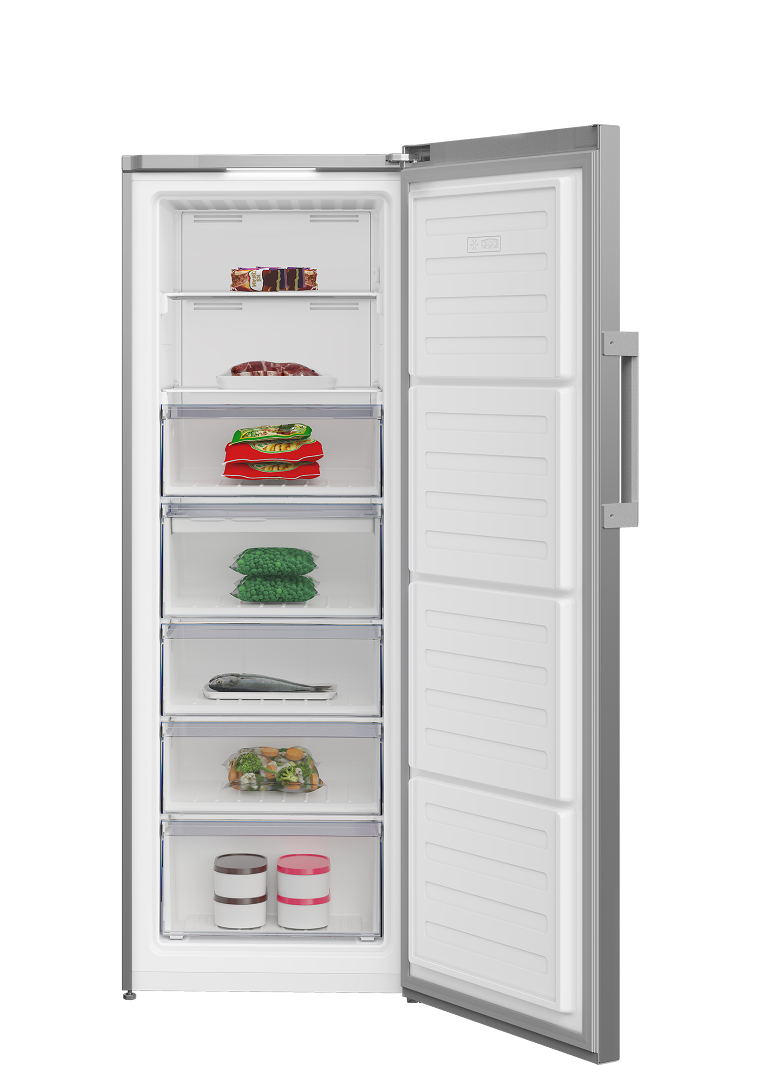 Серебристая морозильная камера шириной 60 см, объемом 293 л и электронным типом управления. Система охлаждения – NoFrost, не требующая периодической разморозки. Идеально подходит для неотапливаемых помещений с температурой воздуха вплоть до -15°С – эксклюзивная технология FreezerGuard от Beko обеспечит бесперебойную работу морозилки даже в таких условиях. Имеет перенавешиваемые двери и функцию быстрого замораживания.