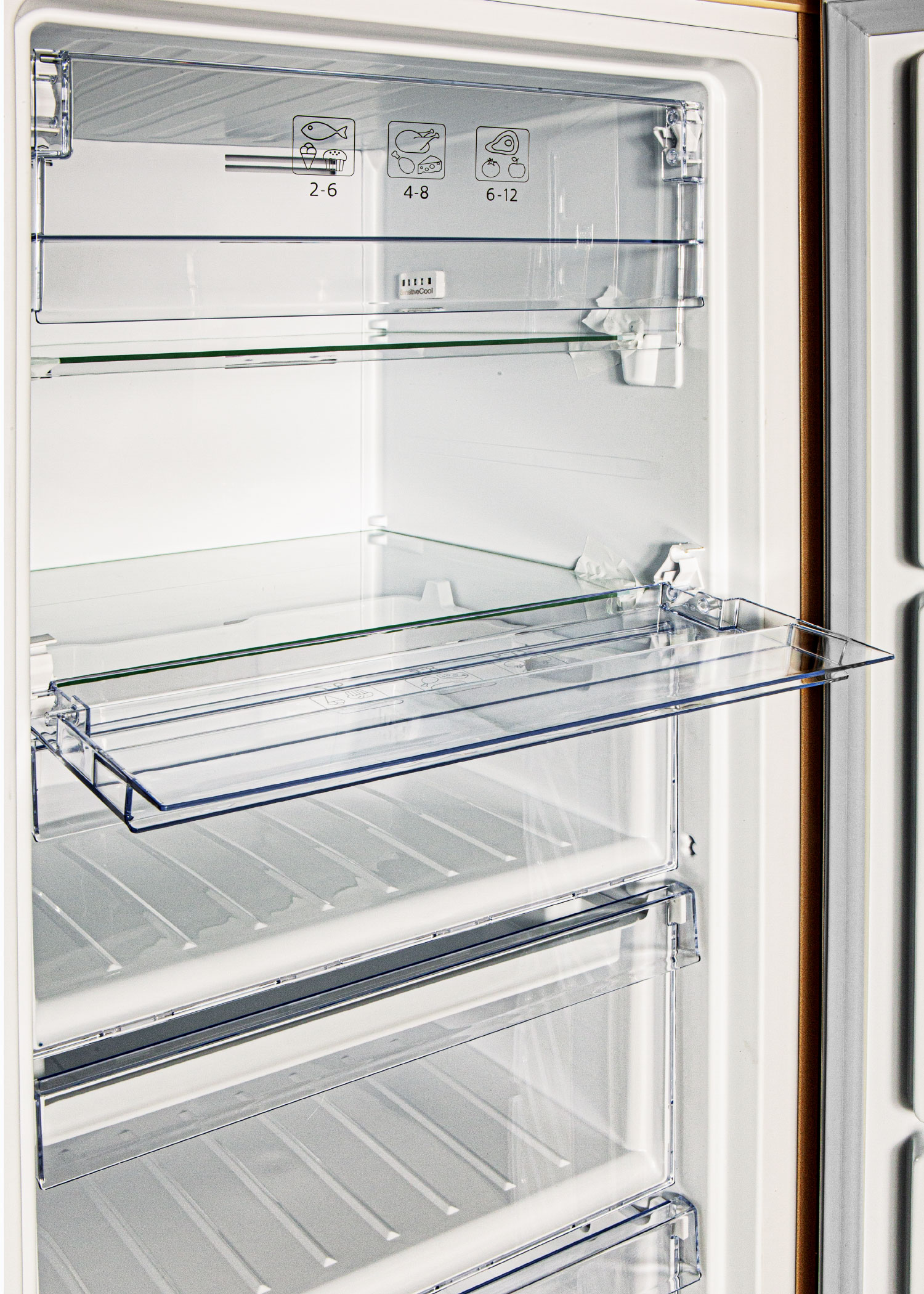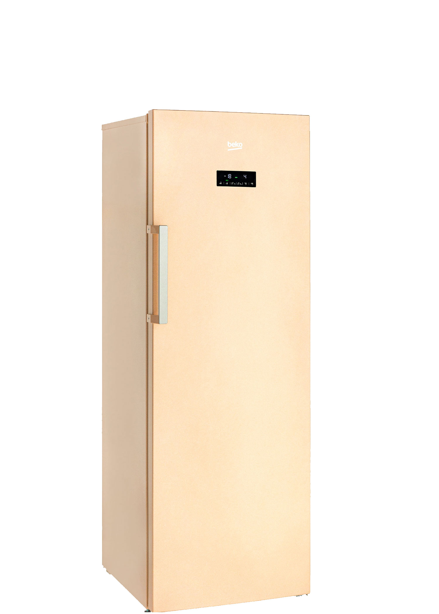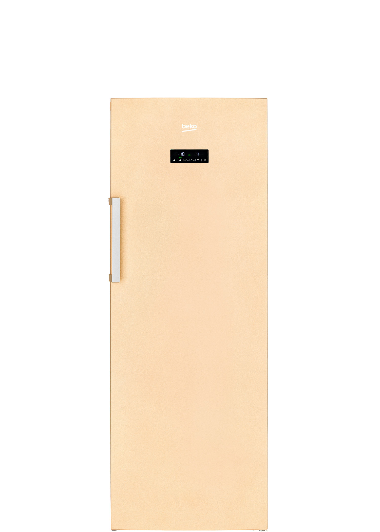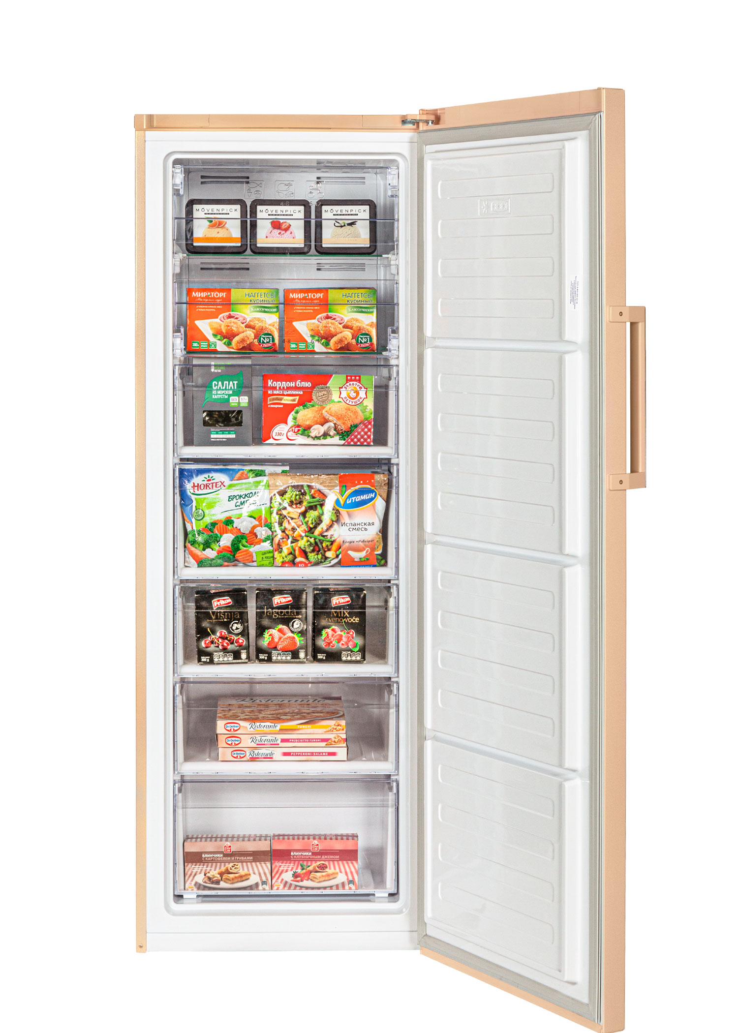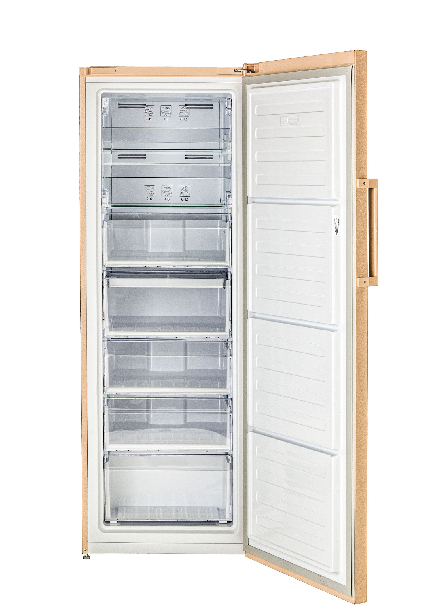 Морозильная камера выполнена в бежевом цвете с эффектом камня и имеет общий объем 290 л. Морозилка оснащена системой охлаждения No Frost (Ноу Фрост), благодаря которой на стенках не образуется лед, и морозильная камера не требует регулярной разморозки. Морозильная камера имеет класс энергоэффективности А+, сенсорный дисплей для удобного управления и функцию быстрого замораживания новых продуктов.