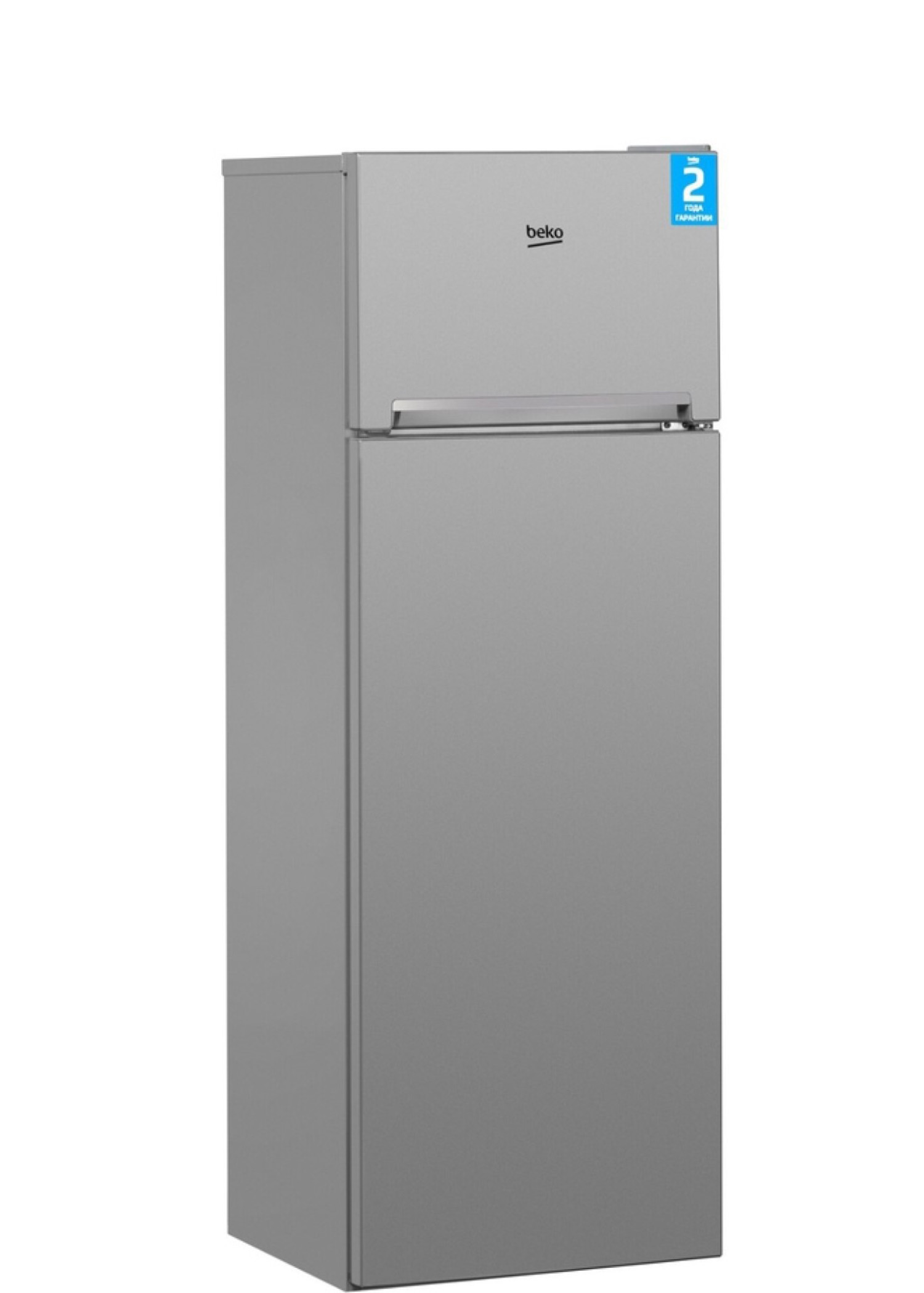 Компактный холодильник серебристого цвета с верхней морозильной камерой, общим объемом 280 л и статической системой охлаждения. Дверцы холодильника и морозилки оснащены антибактериальным уплотнителем и могут быть установлены с любой стороны. В комплект с холодильником входят подставка для яиц и форма для льда.