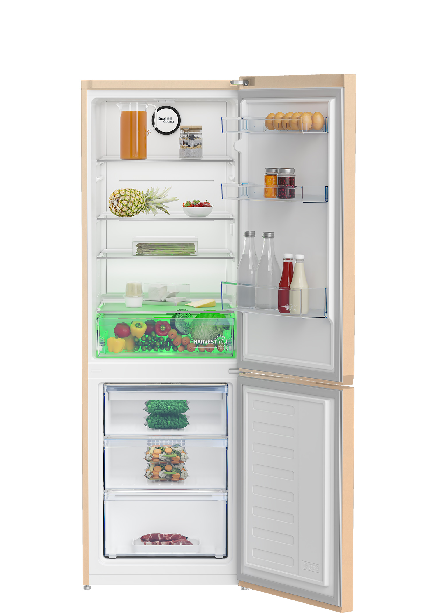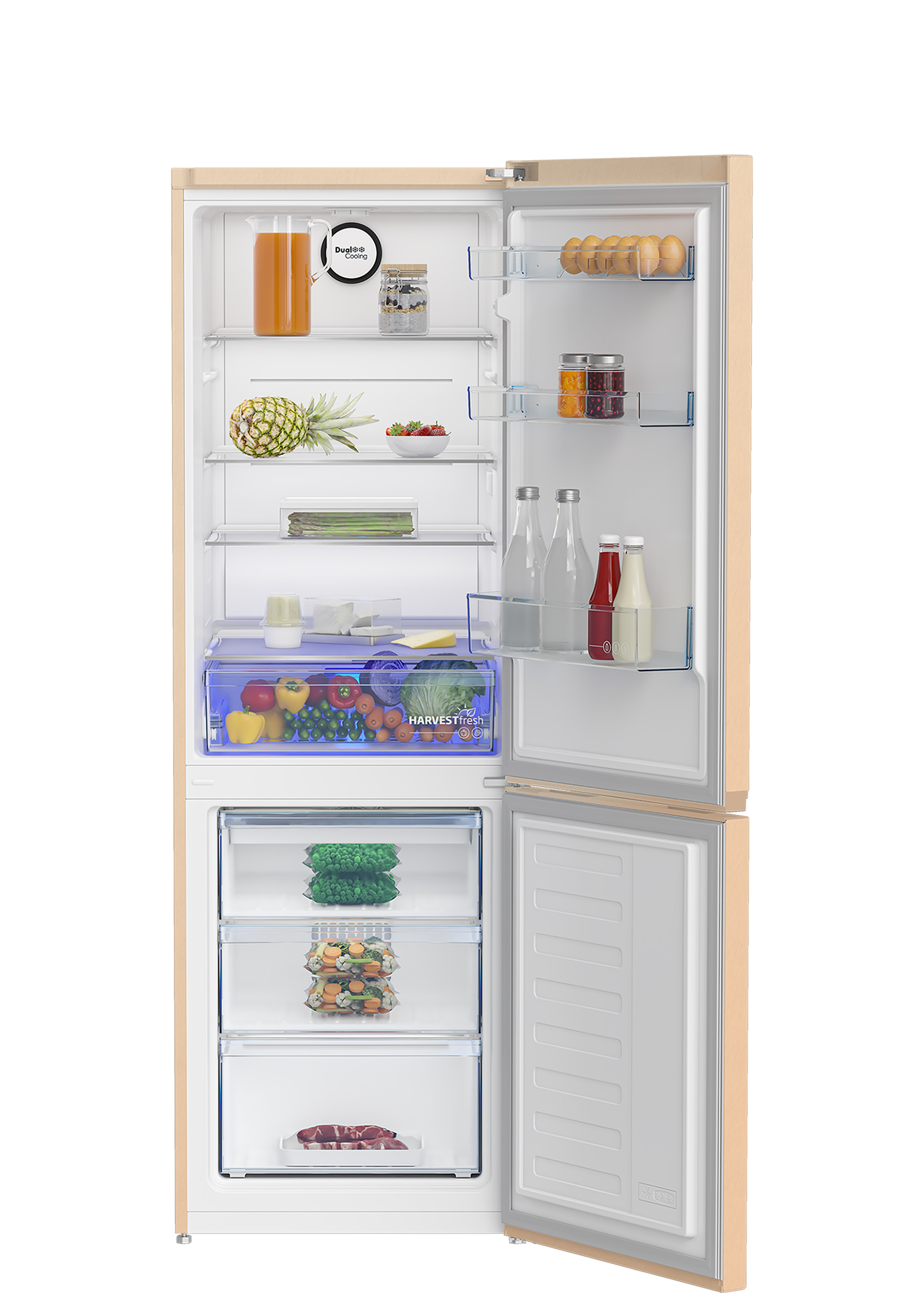 Двухкамерный холодильник с нижней морозильной камерой оснащен двухконтурной системой охлаждения No Frost Dual Cooling (Ноу Фрост), благодаря которой запахи между камерами не смешиваются и холодильник не нужно размораживать. Режим «Отпуск» обеспечивают энергосберегающую работу холодильника, если вы планируете долго не пользоваться холодильной камерой. Вместительный ящик для фруктов и овощей в холодильнике оснащен технологией 3ех цветов HarvestFresh, которая помогает сохранить концентрацию витаминов в свежих продуктах.