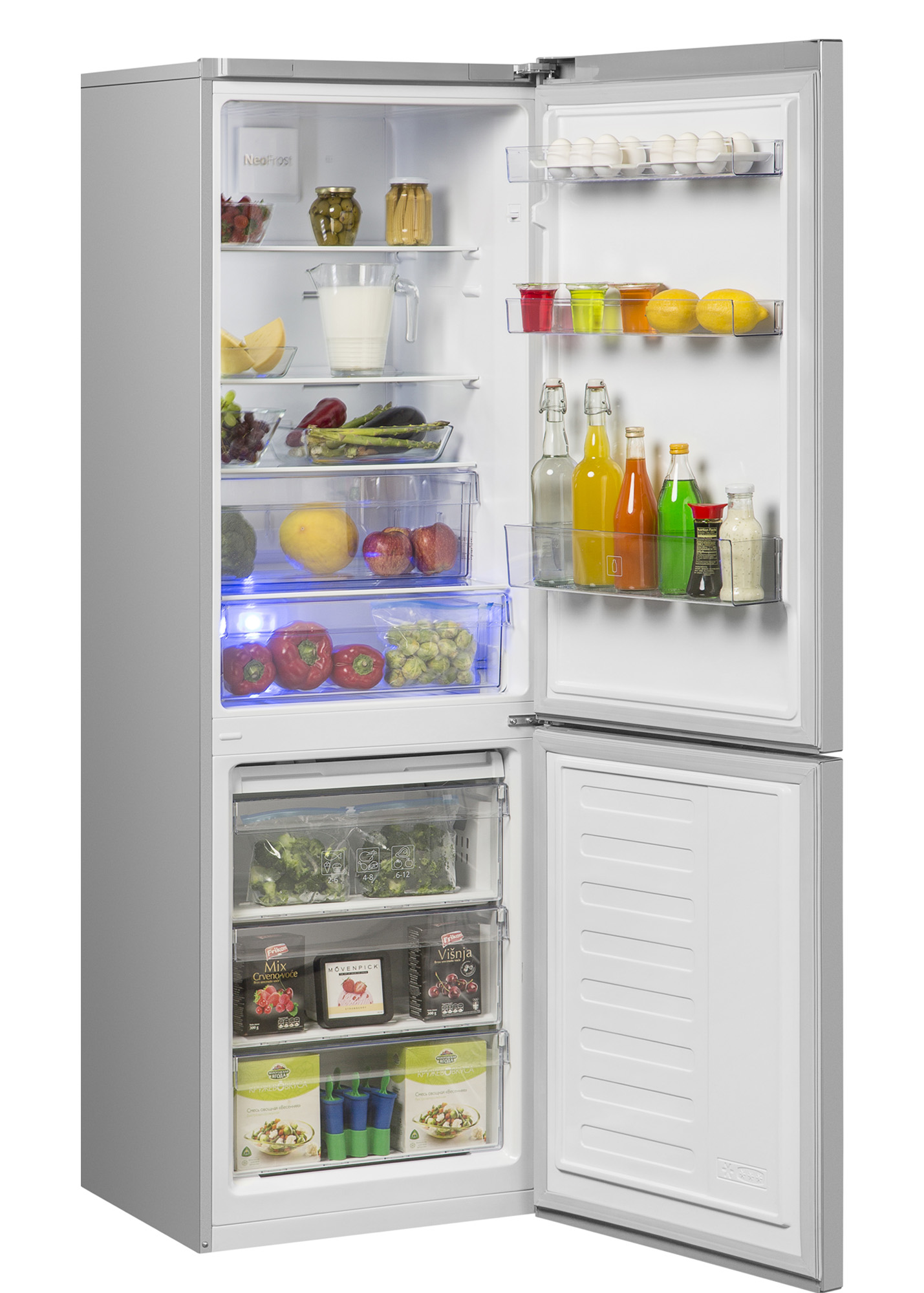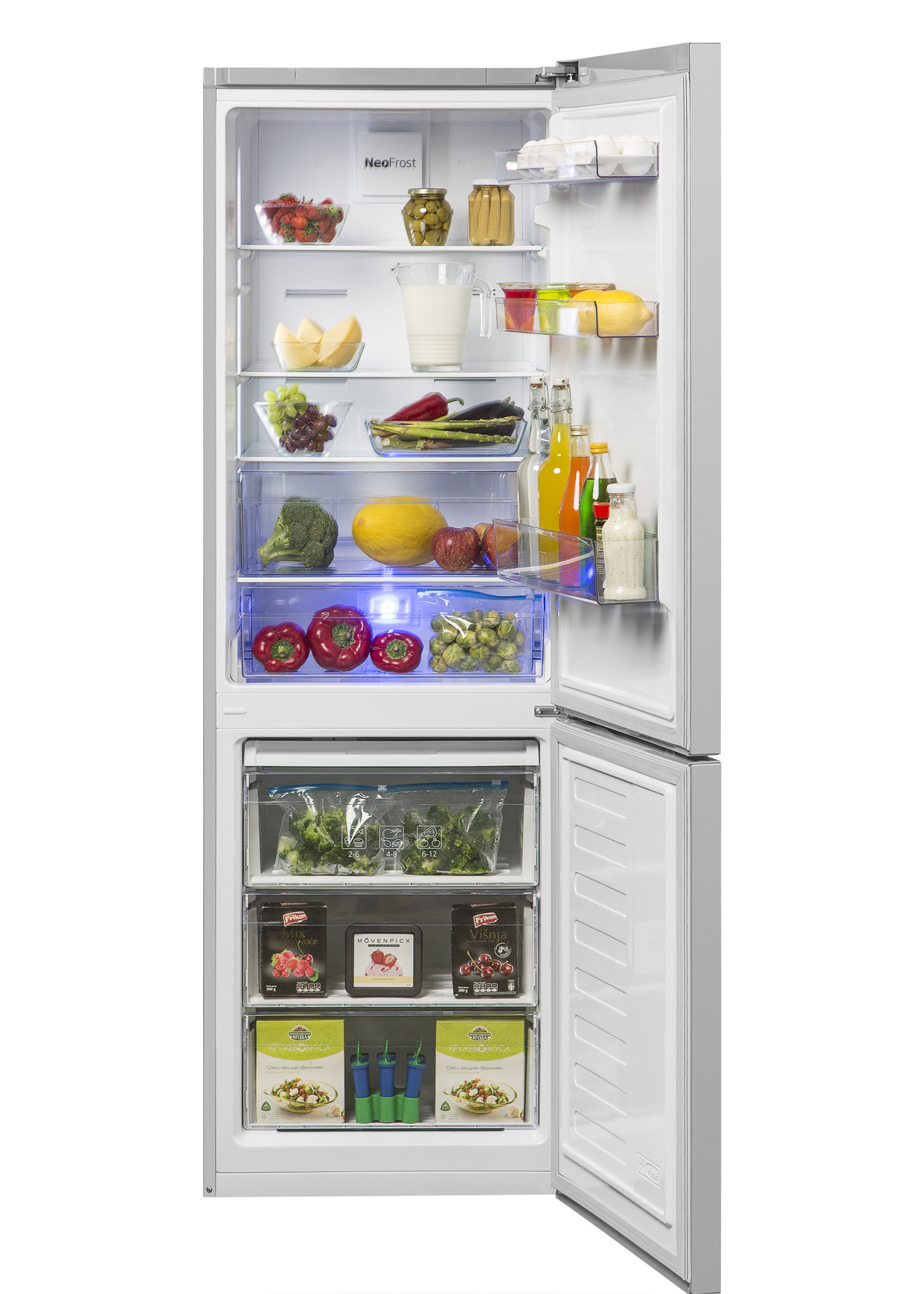 Двухкамерный холодильник оснащен двухконтурной системой NoFrost Dual Cooling, которая обеспечивает раздельное охлаждение холодильной и морозильной камер без смешивания запахов и образования льда. Технология Active Fresh Blue light с подсветкой синего цвета дольше сохраняя свежесть, вкус и витамины фруктов и овощей. Режим «Отпуск» снижает потребление энергии за счет отключения охлаждения в холодильной камере, когда вы уезжаете на длительный срок и освобождаете холодильник от продуктов. Холодильнику присвоен класс энергоэффективности А+.
